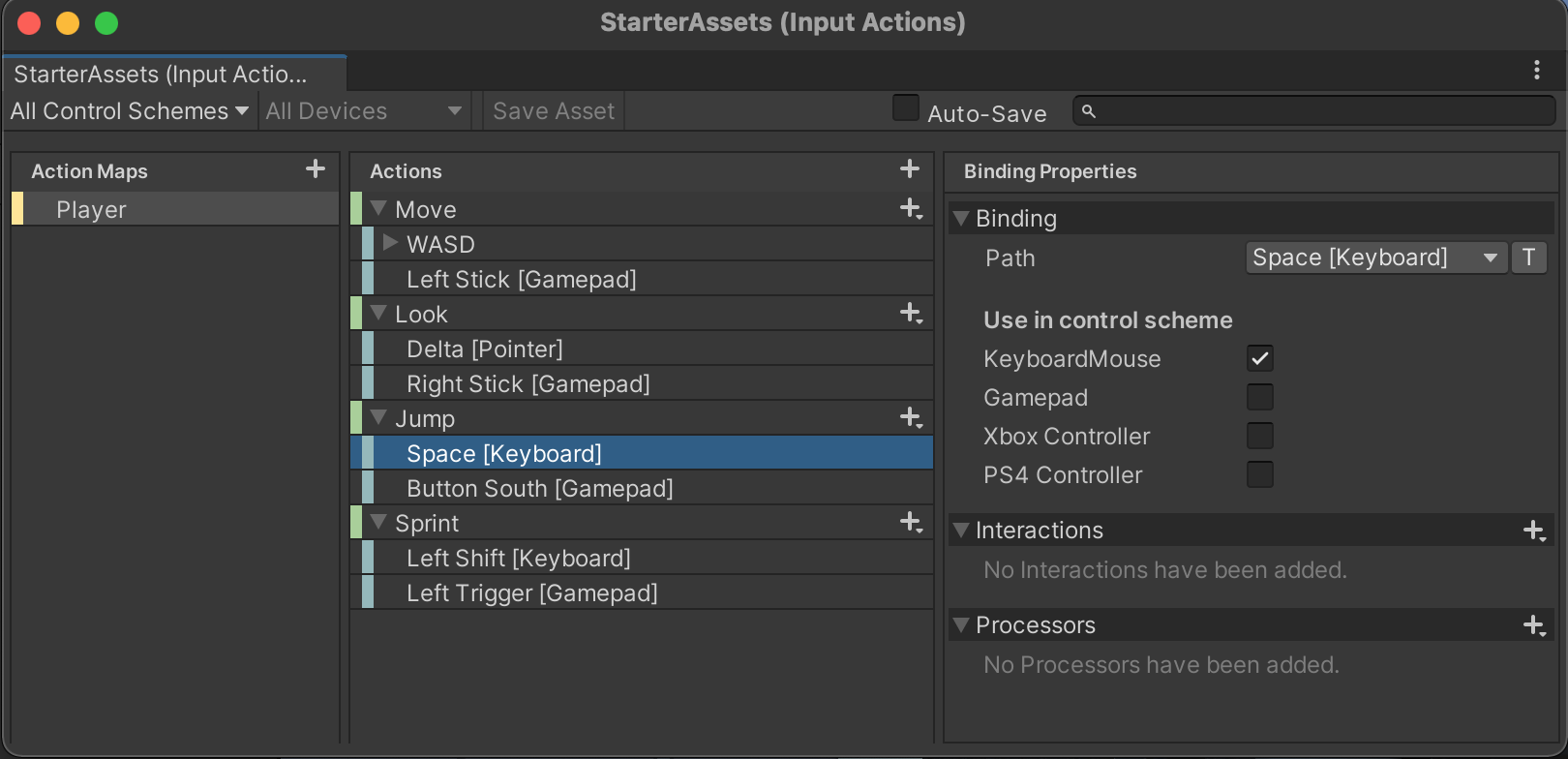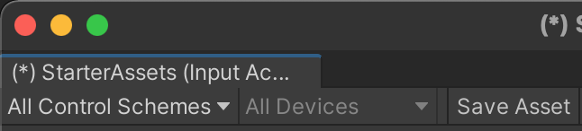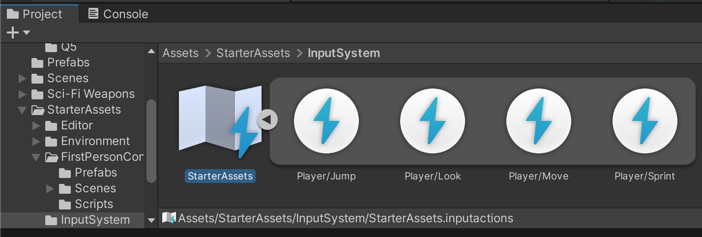 Double-click the StarterAssets input actions file to open the Input Actions configuration window.