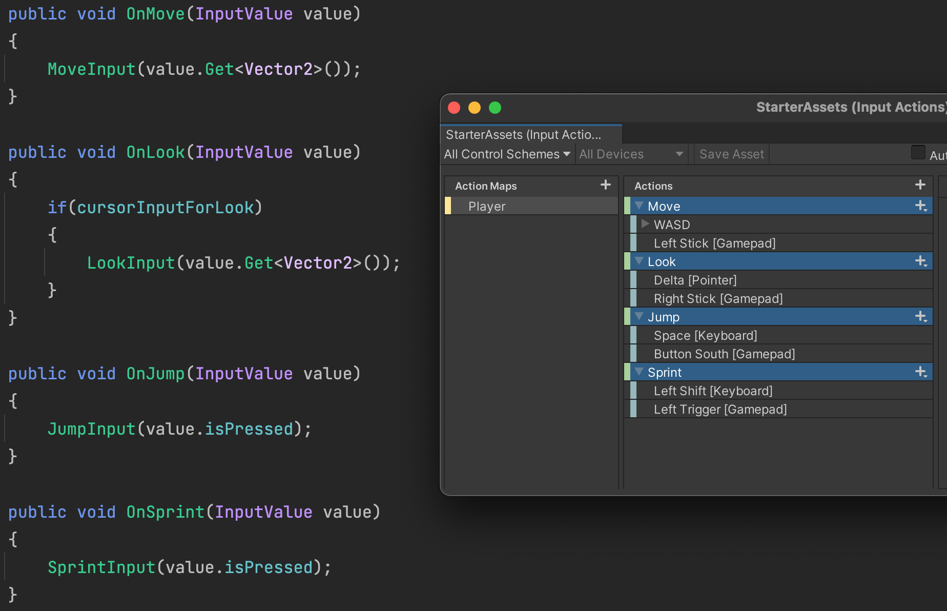 Looking into the StartAssetsInputs.cs that came with the Starter Pack, you will notice that the four actions (Move, Look, Jump, and Sprint) are mirrored in the code with functions (OnMove, OnLook, OnJump, and OnSprint). When the PlayerInput component is set to "Send Messages" as you saw earlier, On{Action} event functions will automatically be called similar to other Unity event functions such as "OnTriggerEnter."