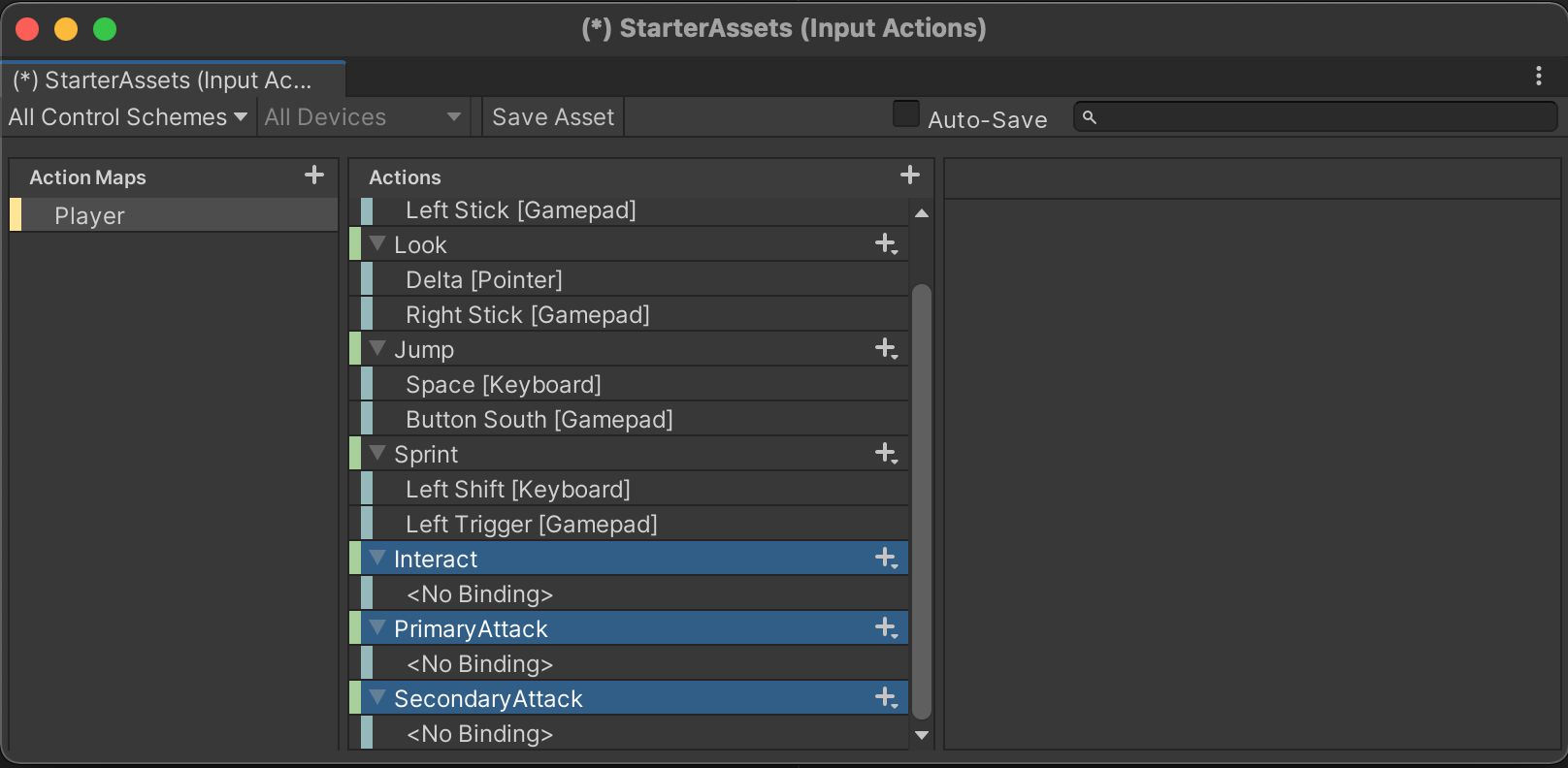 We will add our own Actions for Interact, PrimaryAttack, and SecondaryAttack to the input configuration. Using the + icon to the right of Actions, prepare these three new Actions.