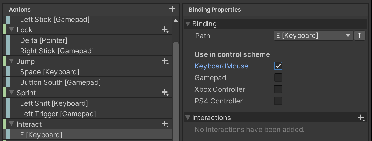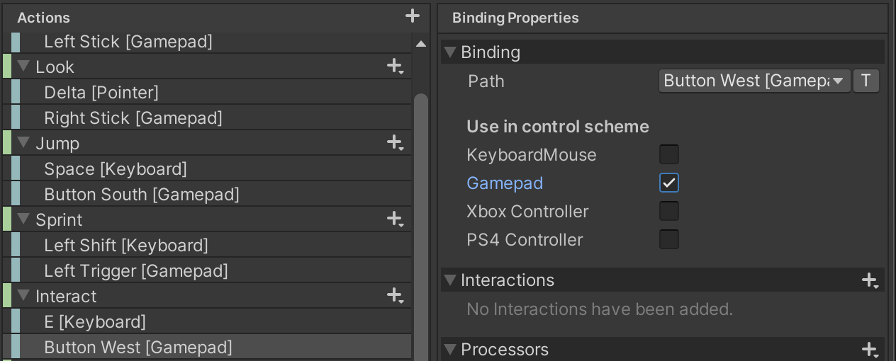 We will bind Interact to the E key and to the Gamepad West button.