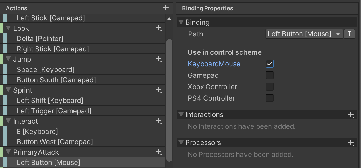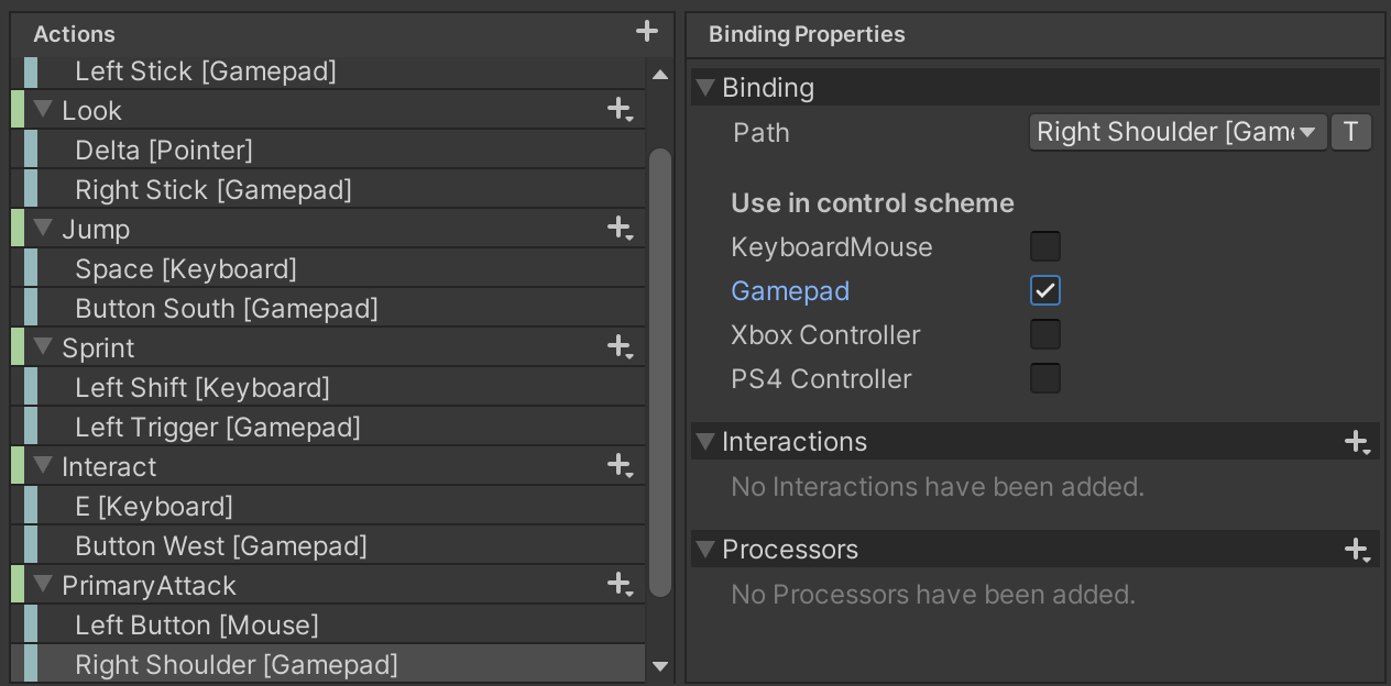 We will bind PrimaryAttack to the Left Mouse Button and to the Gamepad Right Shoulder button.