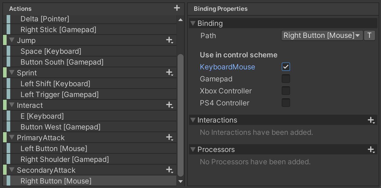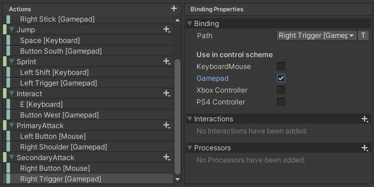 We will bind SecondaryAttack to the Right Mouse Button and to the Gamepad Right Trigger button.