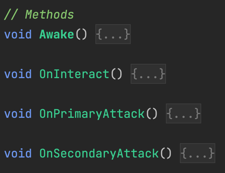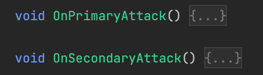 Within PlayerController, we need three matching functions named On{Action} for our new Input Actions. We already wrote PrimaryAttack and SecondaryAttack. Simply rename them OnPrimaryAttack and OnSecondaryAttack.