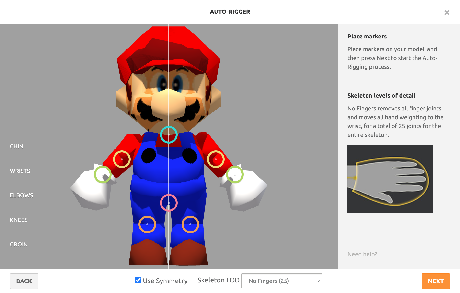 This next screen is extremely important because it normally requires an artist to understand the nuances of rigging the 3D model. To help Mixamo's auto-rigger, we need to give it some guidance on how to interpret the model. First, switch the skeleton level of detail to "No Fingers." Since our character literally has no fingers, we will reduce the complexity of the skeleton to match our simple Mario model. Next, drag each of the markers to the locations shown below and click Next. (Pay special attention to which markers are for left vs. right.)