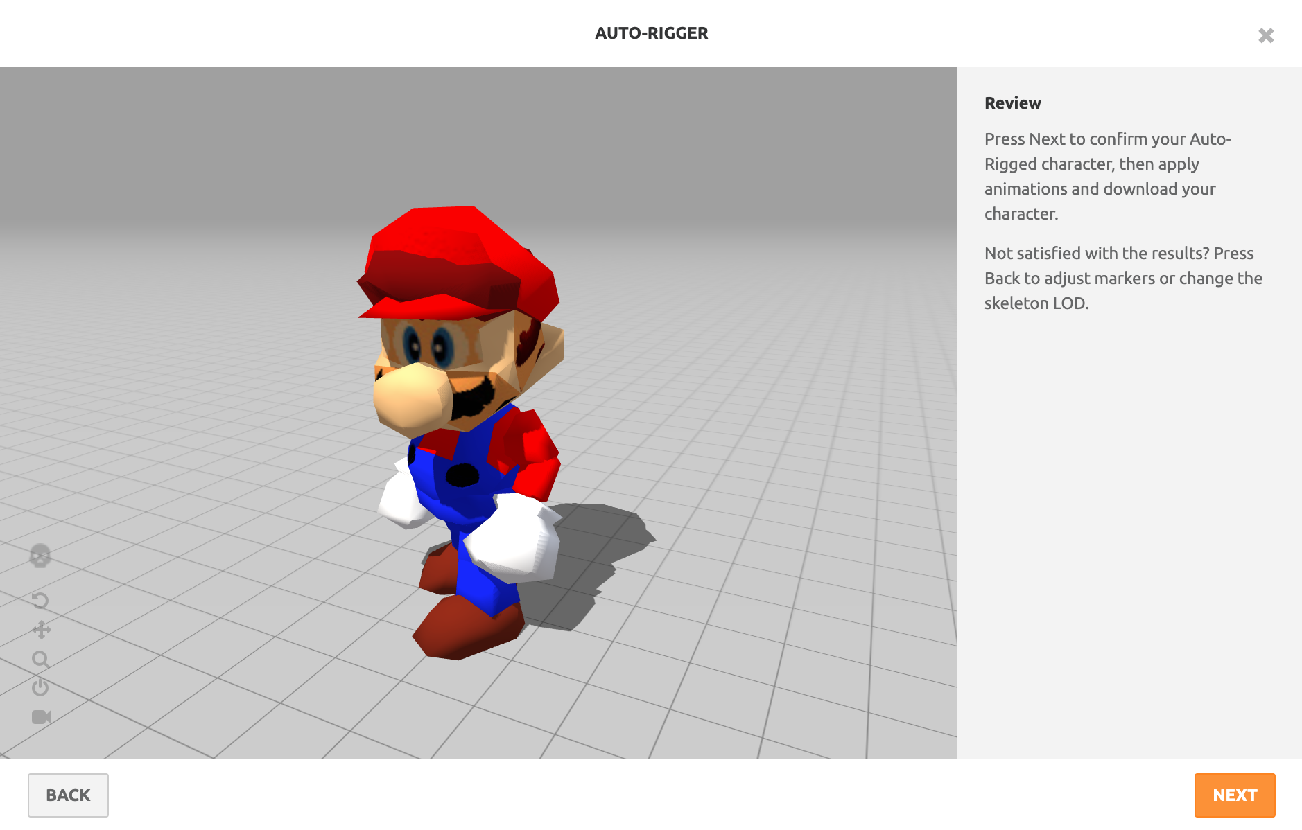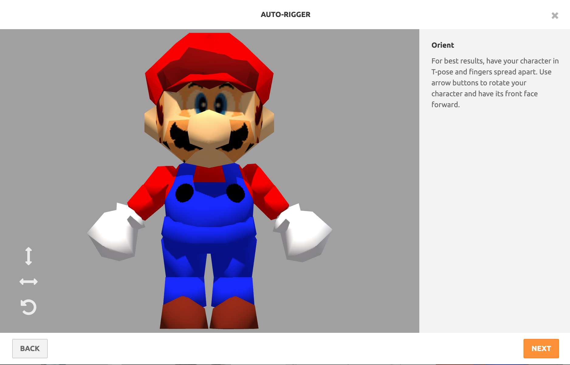 You should see a fully colored and textured rendition of Mario's 3D model in the preview screen. If the model appears as just grey, make sure you upload the ZIP file and not just the OBJ file. The purpose of this window is to make sure the tool is properly interpreting which side of the model is the front. Ensure your character is rotated to match the picture below, and click Next.