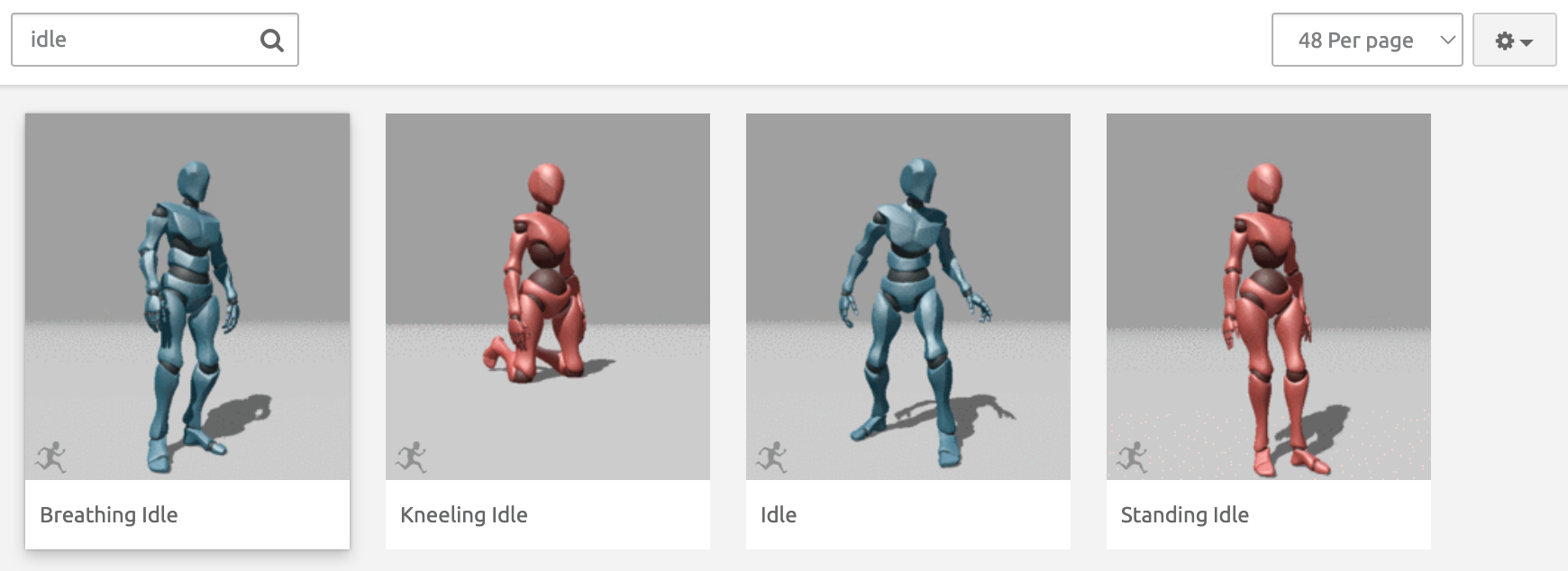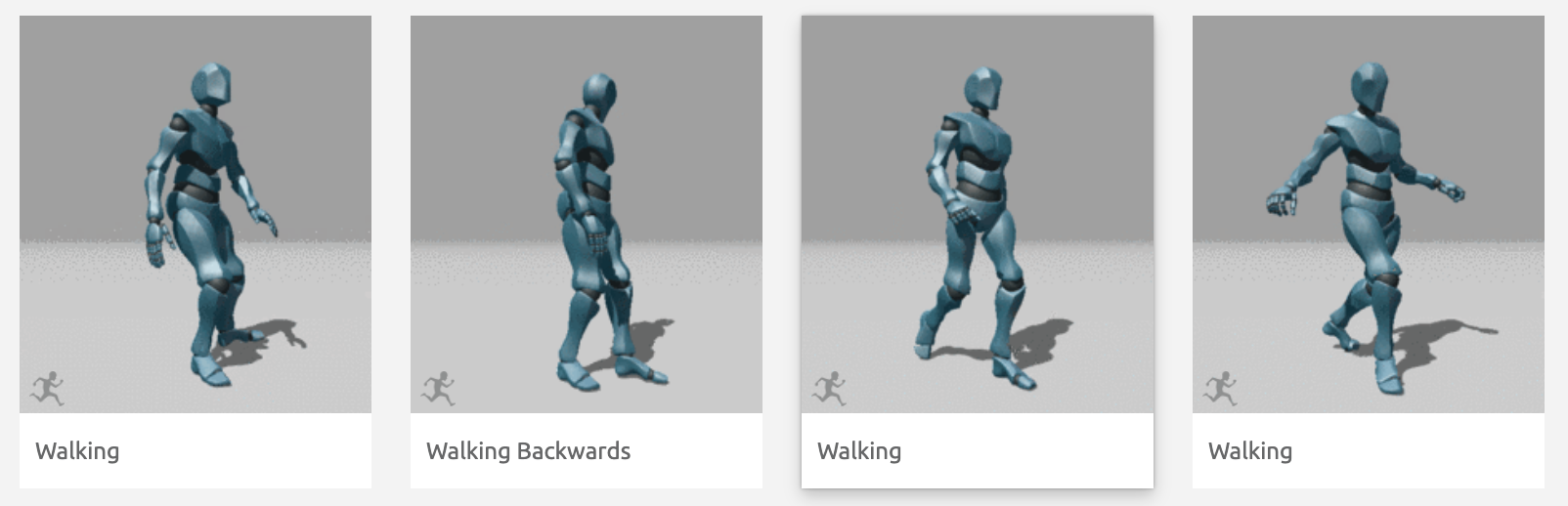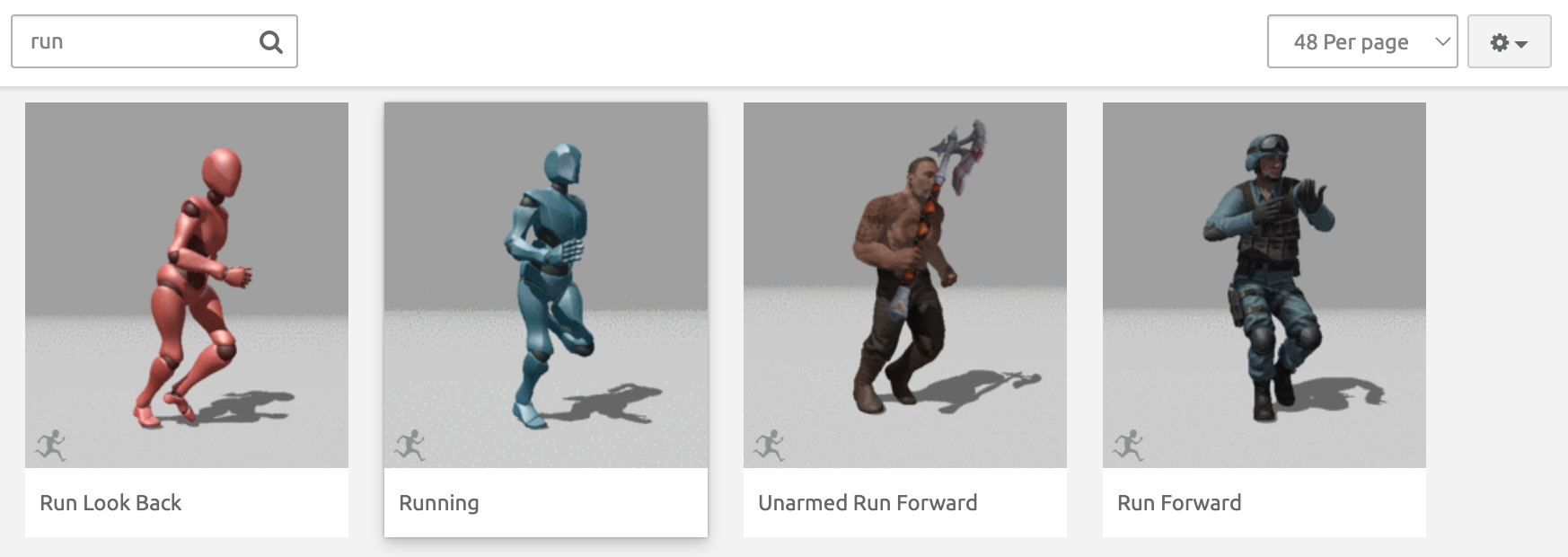 For this assignment, we want to select 3 animations: walk, run, and idle.