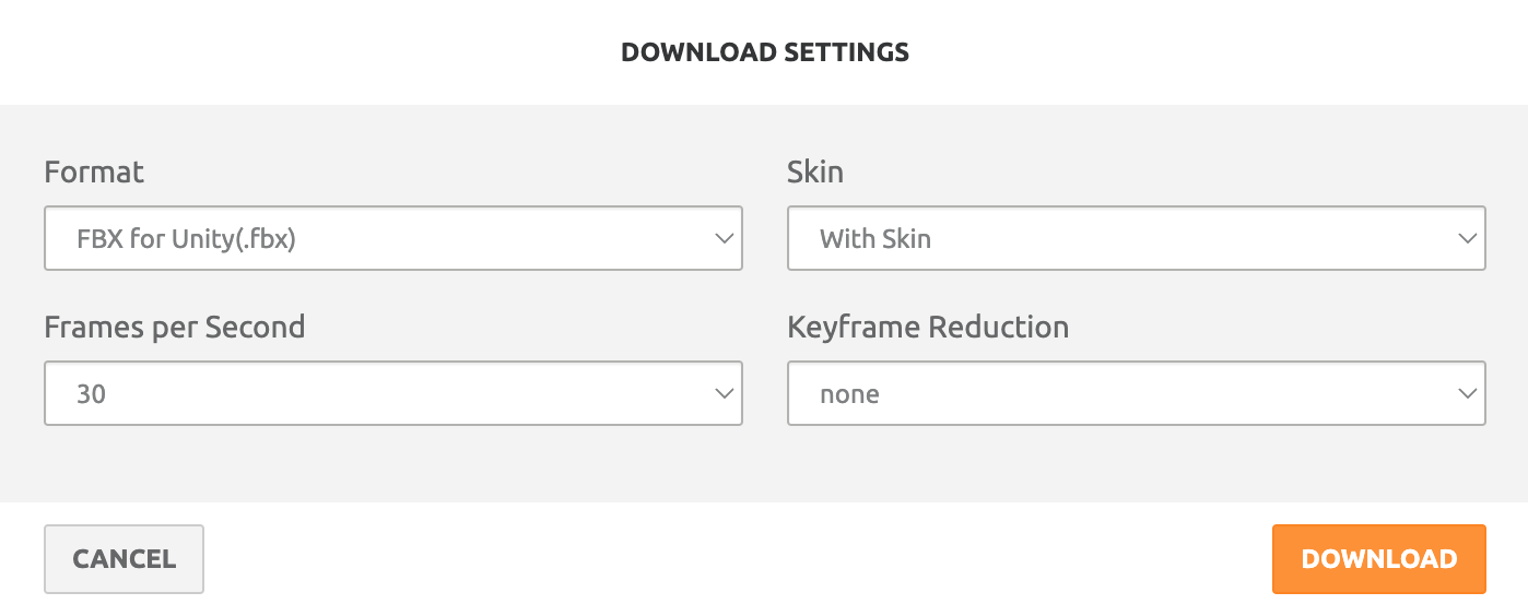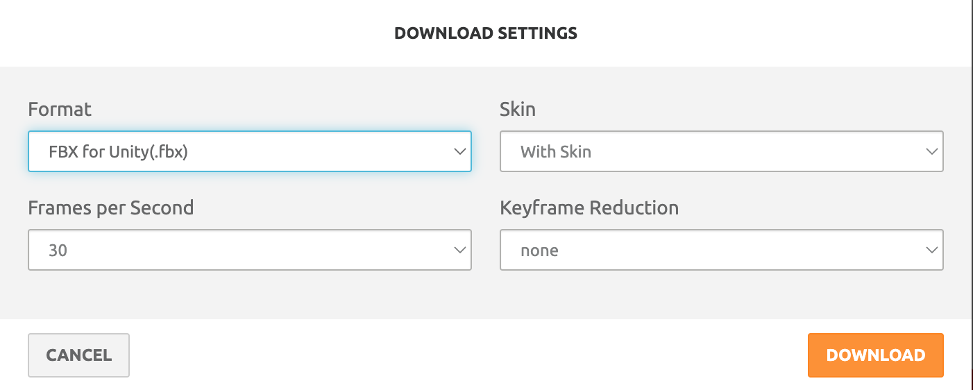 In the download screen, change the format to FBX for Unity. Detailed animations can produce a lot of data, and these other settings enable various optimizations for reducing file size. For now, we can leave them on their defaults. Download the animated character model.