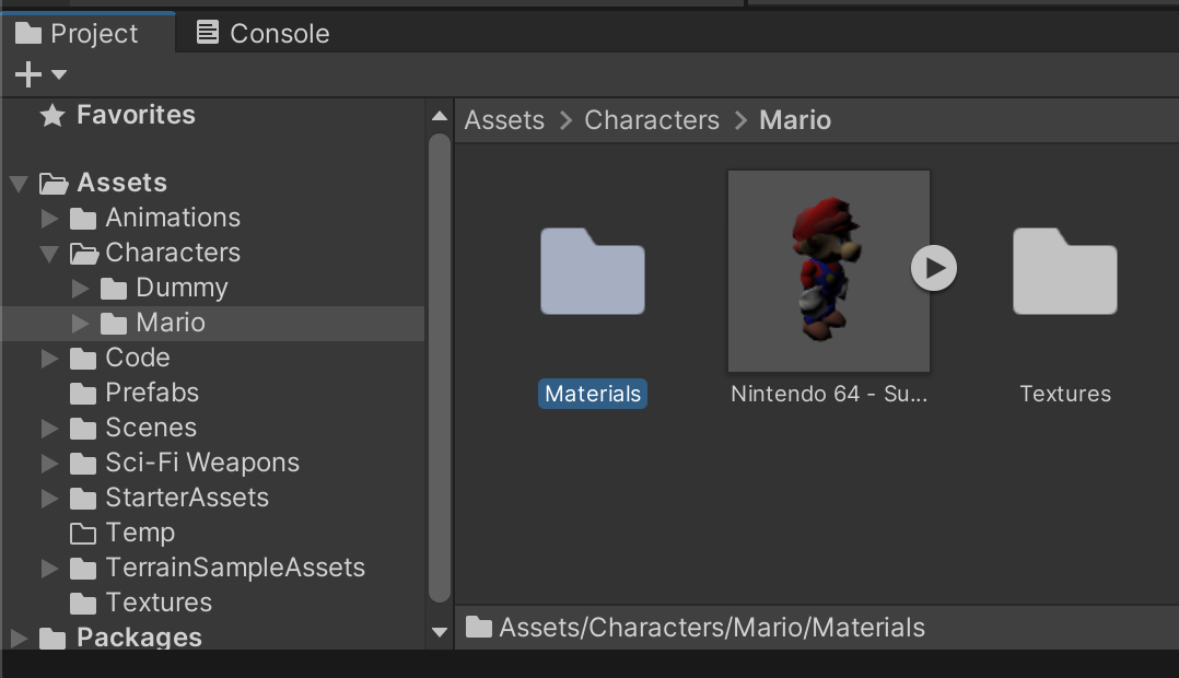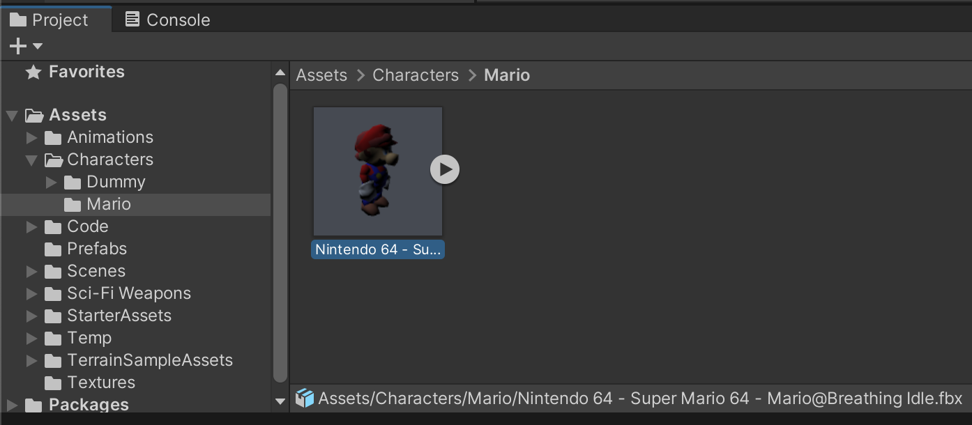 Create a folder /Assets/Characters/Mario/ and drag your Mixamo-generated Mario file into your project.