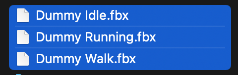 At this point, you should have downloaded 3 separate animated character FBX files for idle, walk, and run.