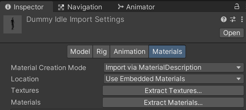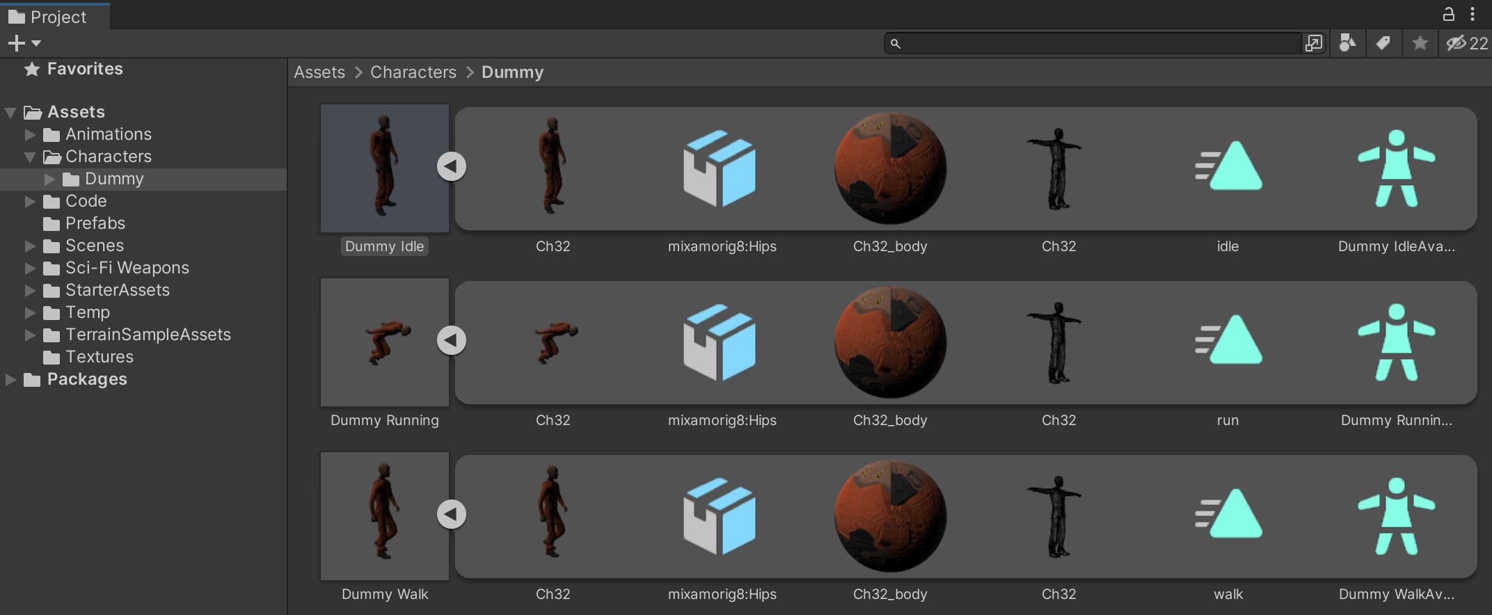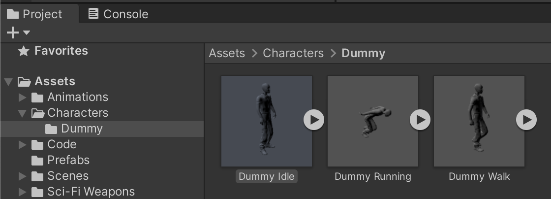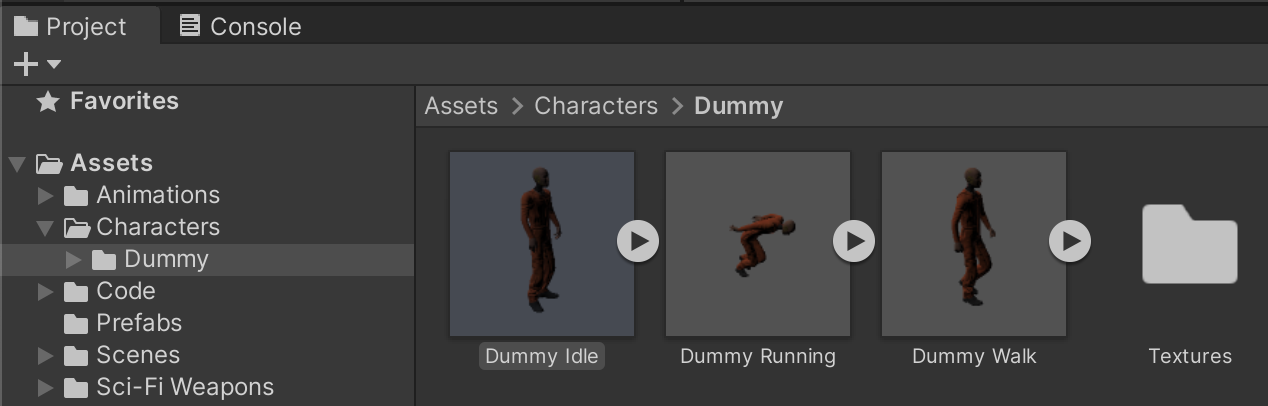 Create an Assets/Characters/Dummy/ folder in the project and drag the 3 FBX files into this folder. We will use the Idle Dummy for both its character model and animation. We will be using Dummy Walk and Dummy Run only for their animations.