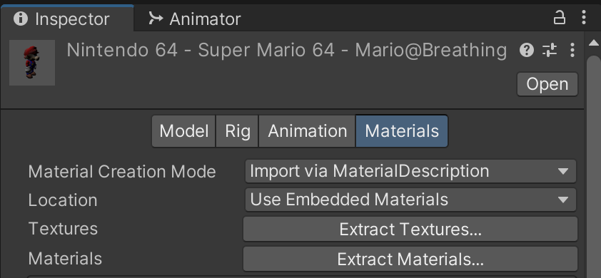 To fix this final graphical anomaly, return to the "Materials" tab when inspecting Mario Idle and click "Extract Materials." Save these materials in Materials folder inside the Mario folder.