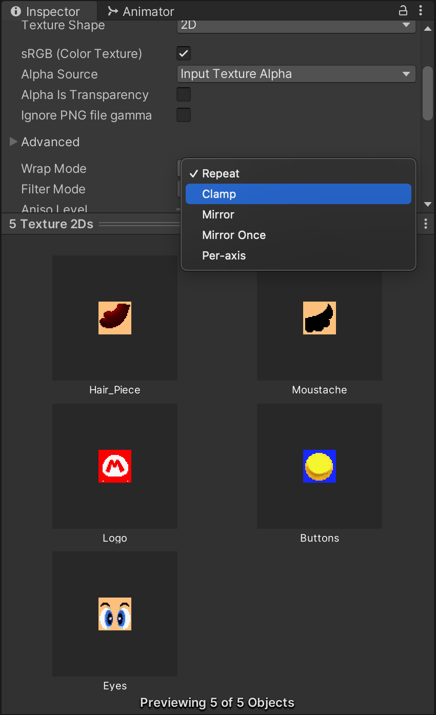 To fix this graphical anomoly, Mario's textures (which you just exported into the Mario/Textures/ folder) need to switch their wrap mode from "Repeat" to "Clamp." This ensures the textures only appear once on the 3D model and do not repeat as they wrap around the edges of the mesh. This setting should be applied to all of Mario's textures.