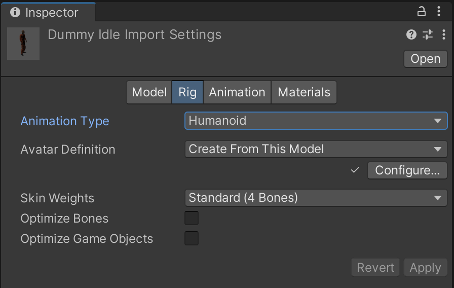 Now that Dummy is rendering properly, we'll need to change other settings on the model assets for them to animate properly. Within the Rig tab, switch Animation Type to Humanoid. Hit the "Apply" button to confirm the change. By telling Unity that the character is humanoid, the game engine is able to supply a wealth of additional tools and options specialized for characters that implement a human skeleton.