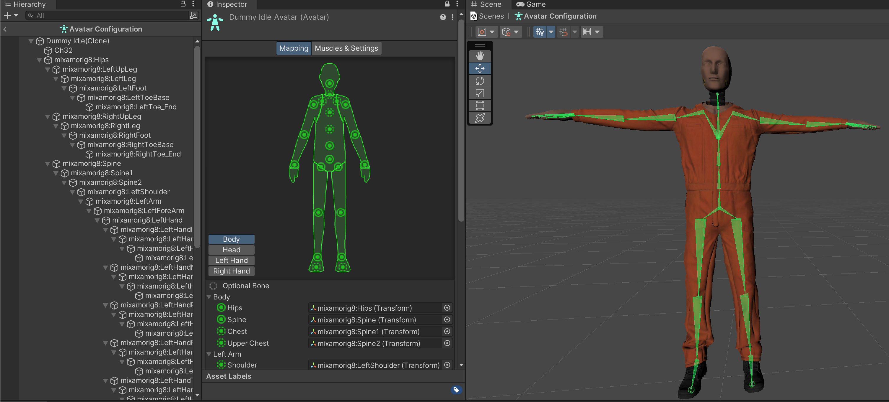 Click Configure next to Avatar Definition to preview how Unity has interpreted the Mixamo skeleton as a humanoid skeleton. The purpose of checking this screen is to confirm that the game engine has correctly interpreted the humanoid limb layout of the character by accurately portraying them in a T-Pose. (Common errors include the wrong limbs being assigned to incorrect body parts or limbs being twisted out of place.) We don't need to make any changes in this window because the character was processed correctly, but it is interesting to see the amount of detail that has been automatically configured in our character asset. Because we've used Mixamo and Unity to automate our character rigging, it is possible that there are some animation inaccuracies that an artist would be able to fix.