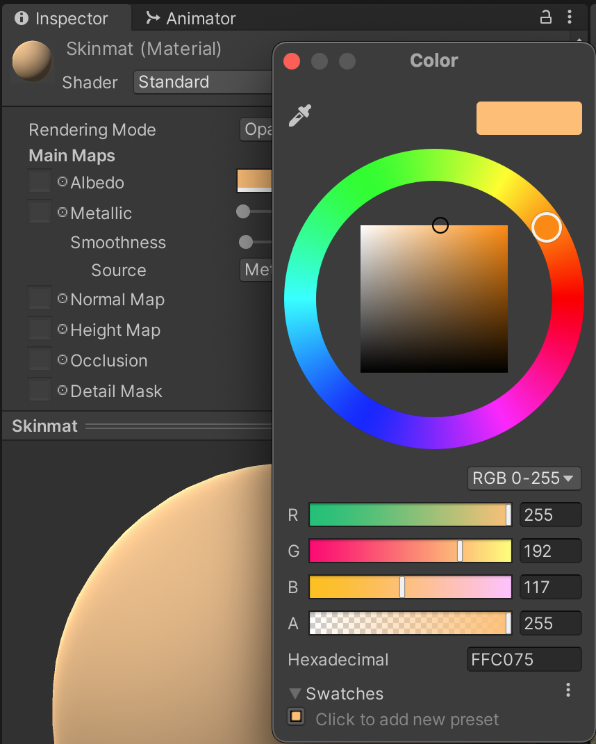 Find "Skinmat" in the newly created Materials folder and adjust the Albedo to match Mario's skin color to the rest of his graphics. Albedo is the base coloring that this material applies to the model.