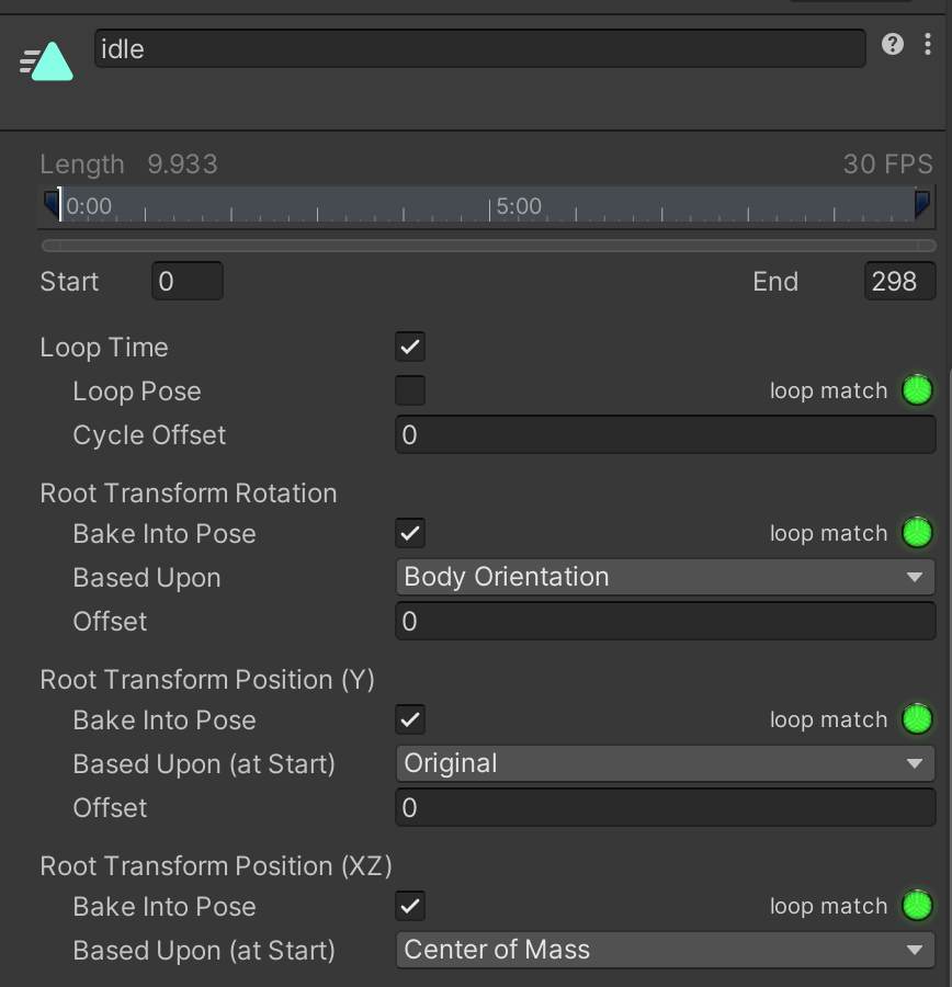 Back in the Inspector window, switch to the Animation tab. Make sure for the Idle asset, the animation is named "Idle" to match. (Default Mixamo names can be inconsistent. For the other two assets, you will name them Run and Walk as needed.) The idle animation should also loop, since the character may be in this state for a prolonged amount of time. Finally, despite selecting "In Place" in Mixamo, animations frequently still have some rotation and movement that can conflict with gameplay. Select "Back into Pose" for Rotation, Position (Y), and Position (XZ) to make sure the character is still held in place despite the animated movement. Without these settings, you might experience such animation glitches as the character slowly sinking into the floor when they walk.