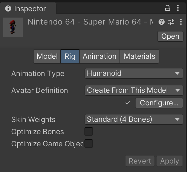 Now that Mario is rendering properly, we'll need to change other settings on the model asset for it to animate properly. Within the Rig tab, switch Animation Type to Humanoid. Hit the "Apply" button to confirm the change. This enables the same expanded set of humanoid features as our other character.