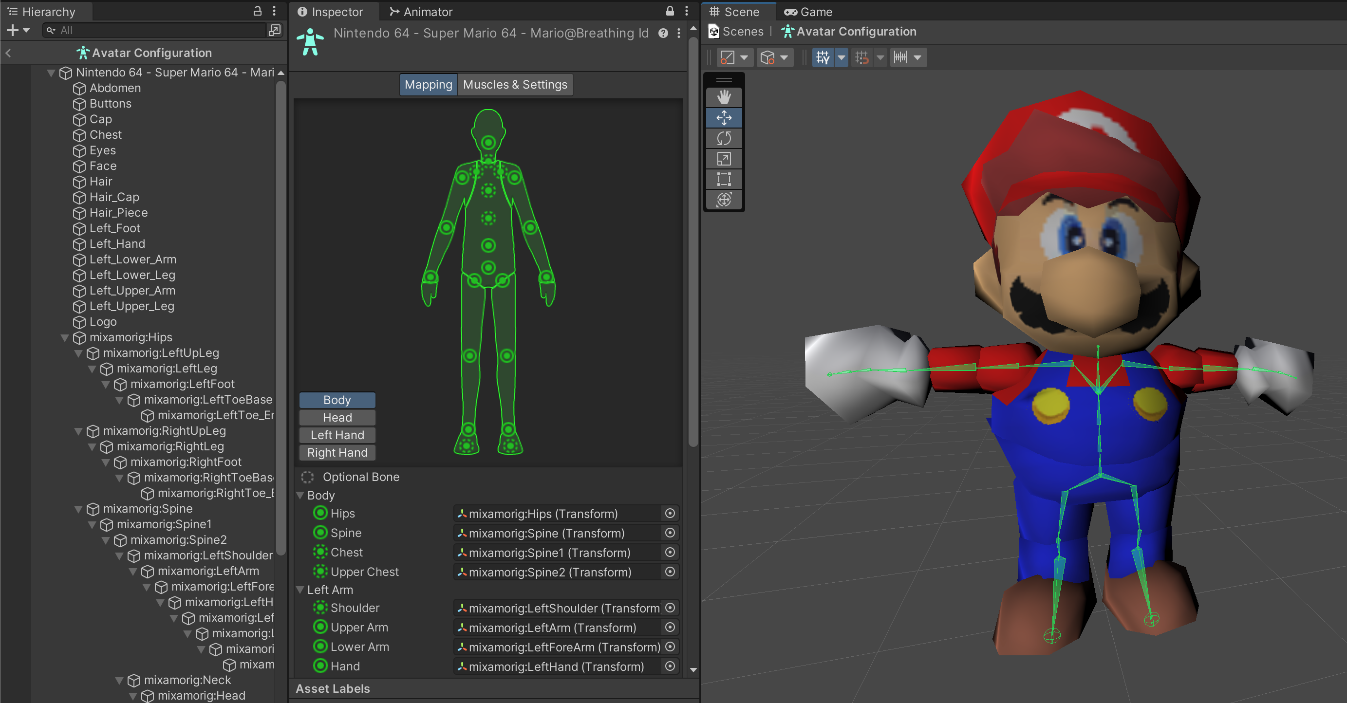 Click Configure next to Avatar Definition to preview how Unity has interpreted the Mario rigging. You should be able to confirm that Mario has been properly configured based on his t-pose.