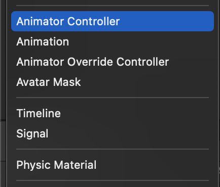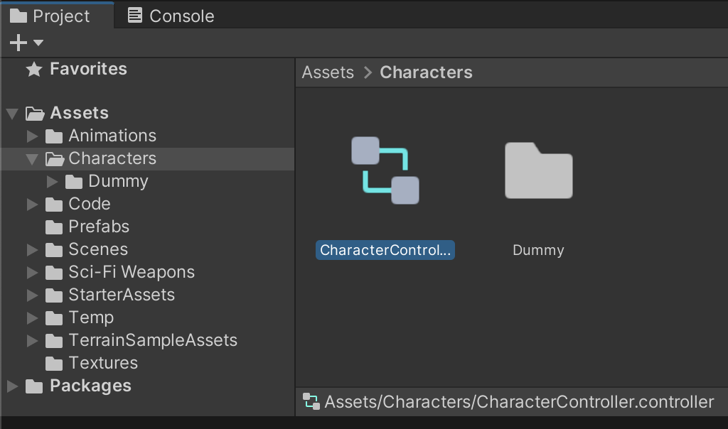 In order to enable movement and combine the 3 idle, walk, and run animations which are held in 3 separate assets, we will utilize an Animator Controller to coordinate all these assets. Because this Animator Controller will be reused for multiple humanoid characters, we will store it in the /Assets/Characters/ folder. Create an Animator Controller named CharacterController from the Project window.