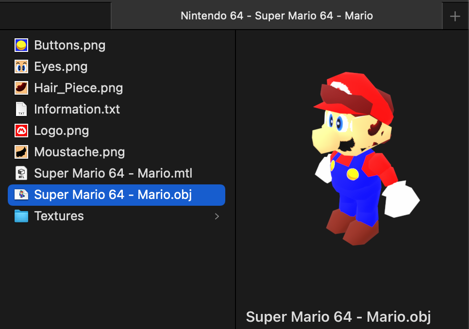 We will be borrowing an extracted 3D model of Mario from Nintendo's Super Mario 64. The model can be downloaded from Canvas.
