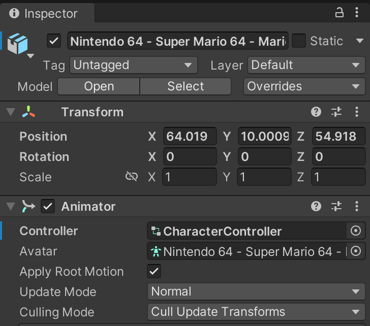 Mario should also use the same character animator controller you made previously. The ability to re-use these animator and animation assets is the benefit of animation retargeting, which requires using the Unity humanoid rig.