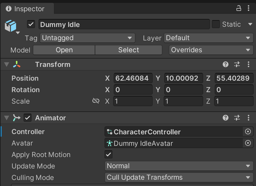 Inspect the Dummy character you just added to your scene and set it's Animator's Controller value to the CharacterController you just created.