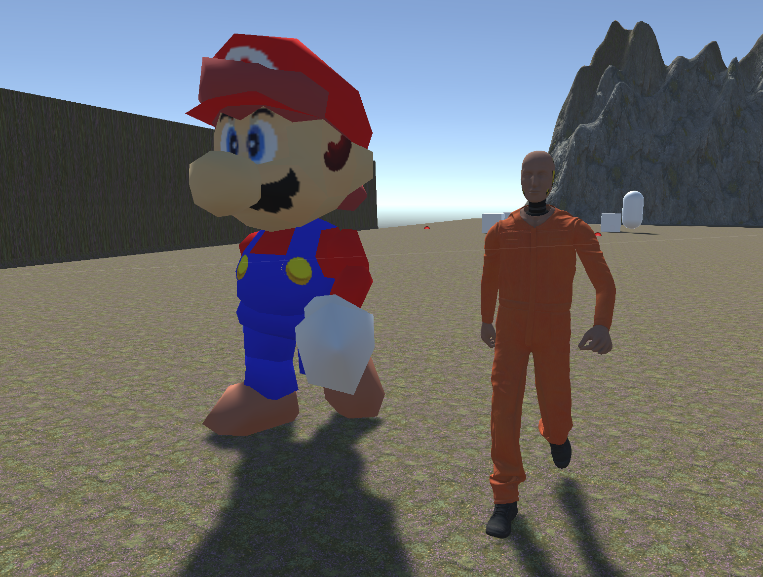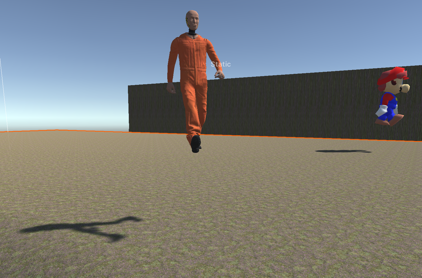 Next, we will implement our old enemy behaviors on our new characters. Using enemy #1 and enemy #2 from the prior assignment as a reference, configure Enemy and NavMeshAgent components on both Dummy and Mario. (A shortcut is to just copy and paste the components from your old enemies onto your new characters to retain the prior settings.) The new characters should function identically to the old enemies in the prior assignment: one of the characters should follow you all the time, and the other should patrol. Turn off the old capsule enemies once your new characters have been set up. Test the game now and confirm that while the characters chase/patrol, there are a couple glitches: 1) The characters are not grounded. 2) The motion of the characters' feet do not match their speed.