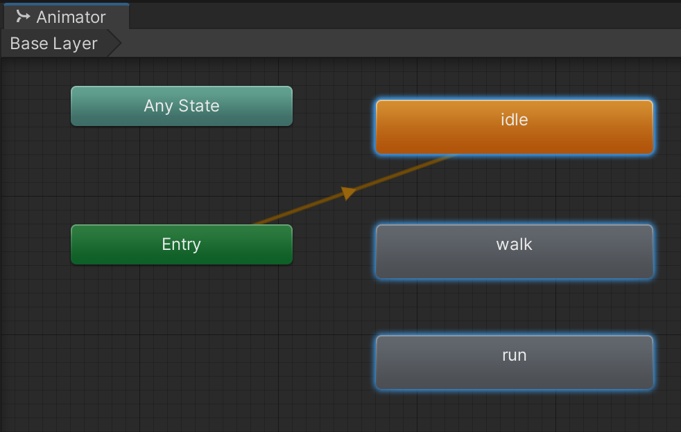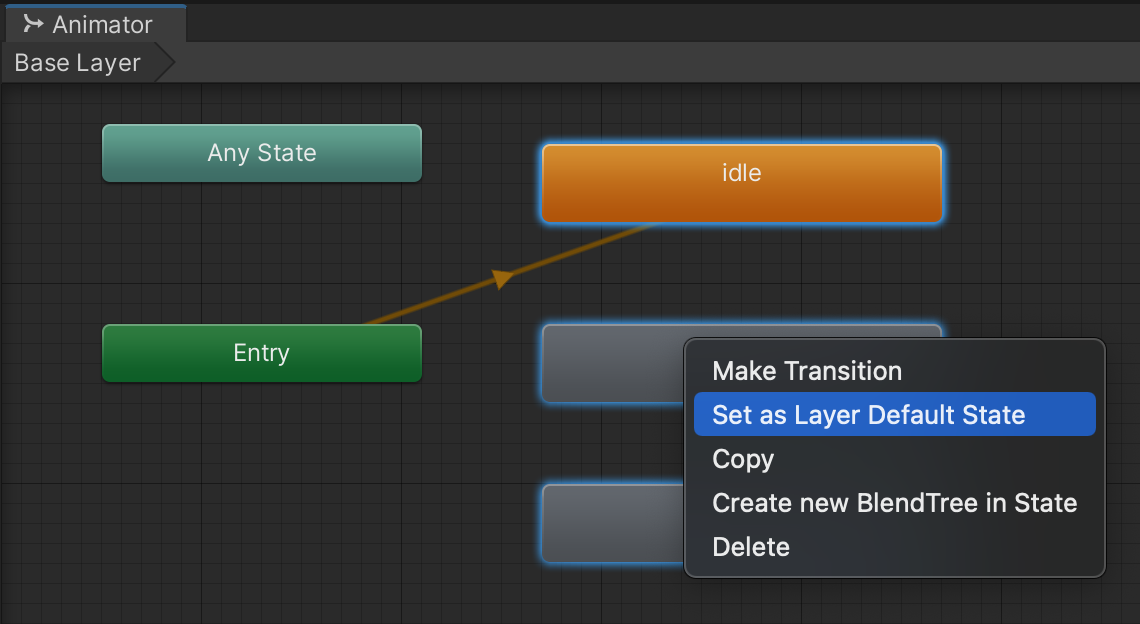 We will set up transitions in a future step. For now, you can test each of the 3 animations by changing which one is the animator's default and resuming gameplay. Confirm that all 3 animations work for your character in-game.