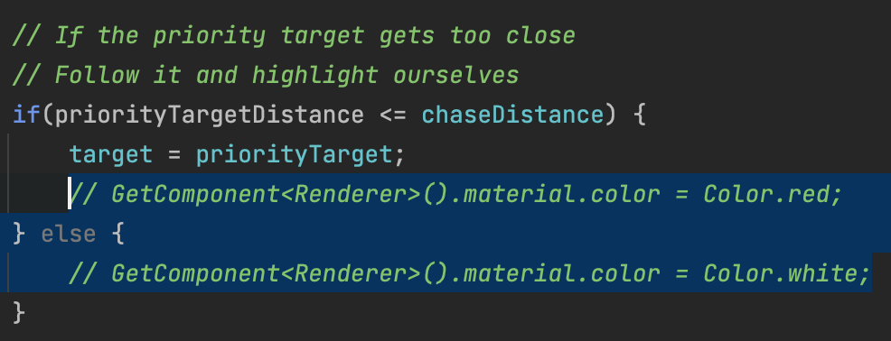We will be reusing all of our old enemy code, but we have to make a small change because our new characters do not have the same mesh renderer structure as the old capsule enemies. In the enemy script, comment out the code that highlights the character in red when it is chasing you. This approach does not work on more complex character models.
