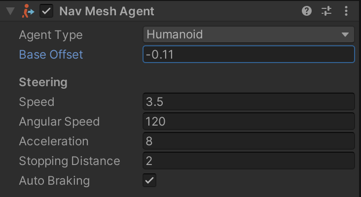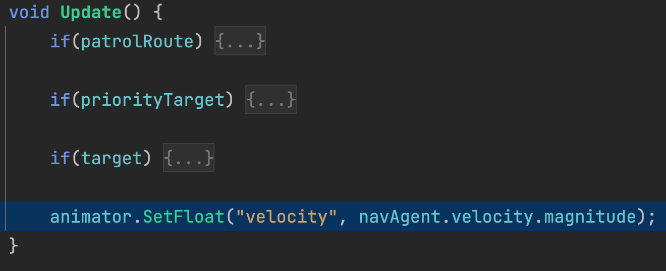 Finally, we enhance our enemy behavior to share the velocity measurement from NavMeshAgent with the Animator through the velocity parameter.