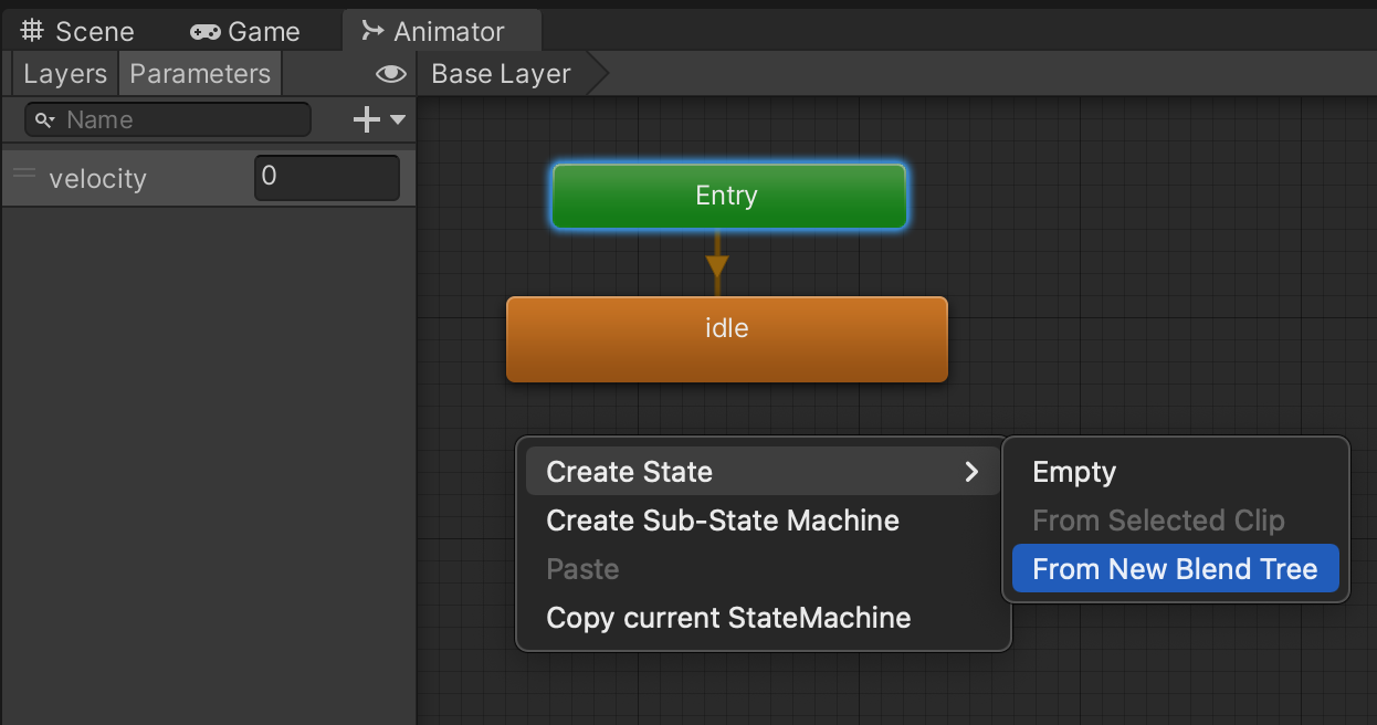 After you've confirmed the characters are properly grounded, double-click your character animator controller to open it in the animator tool. Delete "walk" and "run." Add a float parameter for "velocity" and right-click to create a new blend tree.