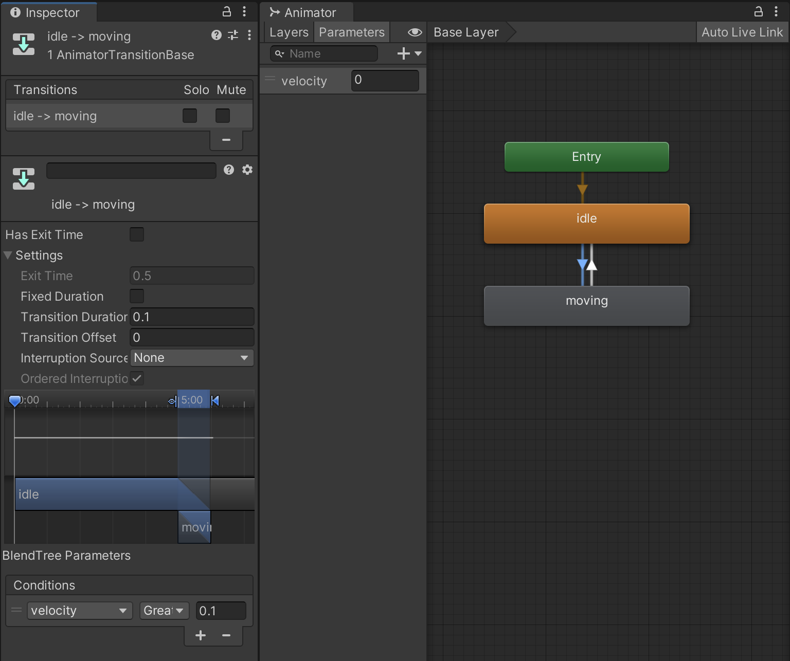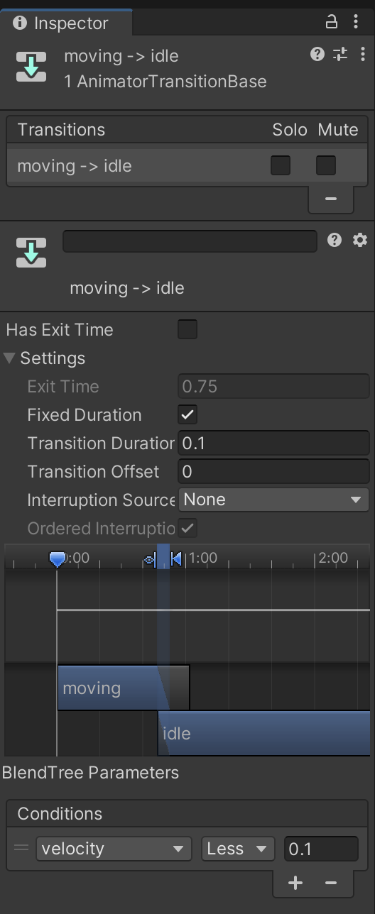 Using the inspector, rename this new blend tree to "moving" and set up transitions both directions between "idle" and "moving." The animation is moving when the velocity is high enough. Notice that (unlike with 2D animations) we use a Transition Duration value to create a blending animation where we can be partially idle and partially walking.