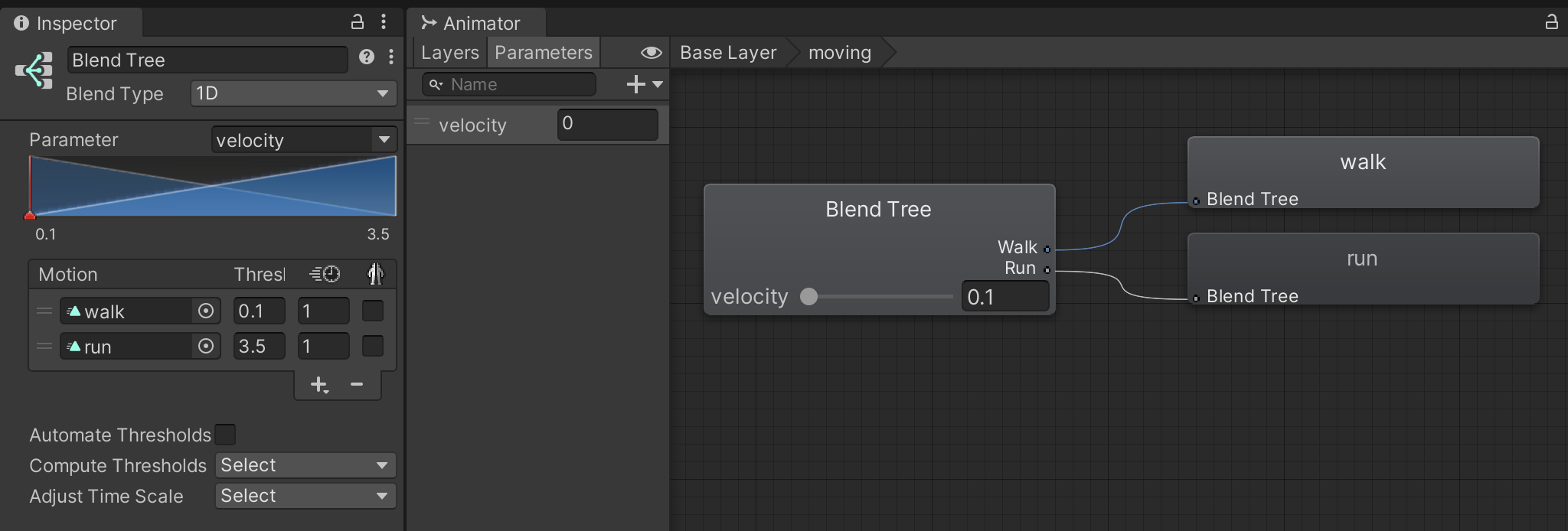 Double-click "moving" to enter the blend tree. Select the blend tree node and configure a 1-dimensional blend using the "velocity" parameter. The two motions we are blending will be the "walk" and "run" animations you downloaded from Mixamo. (Expand your character assets to select them.)