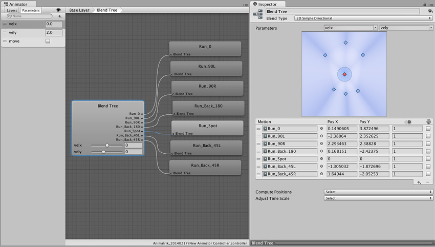 This technique used only a 1-dimensional blend between walk and run. There are many other advanced techniques and blends you can do in the future, such as this 2-dimensional blend tree (shown below) that includes turns and backtracking as depicted in this example screenshot from Unity's documentation. (This is described only as an example. You do not need to create this right now.)