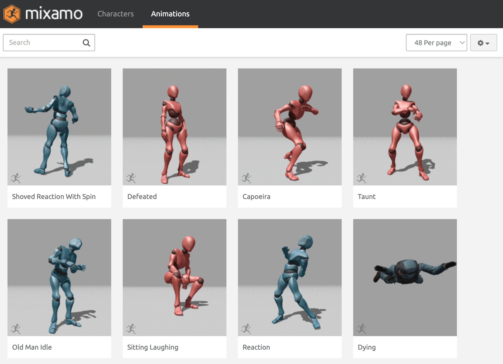Once you are logged in, you will see Mixamo has sections for Characters and Animations.