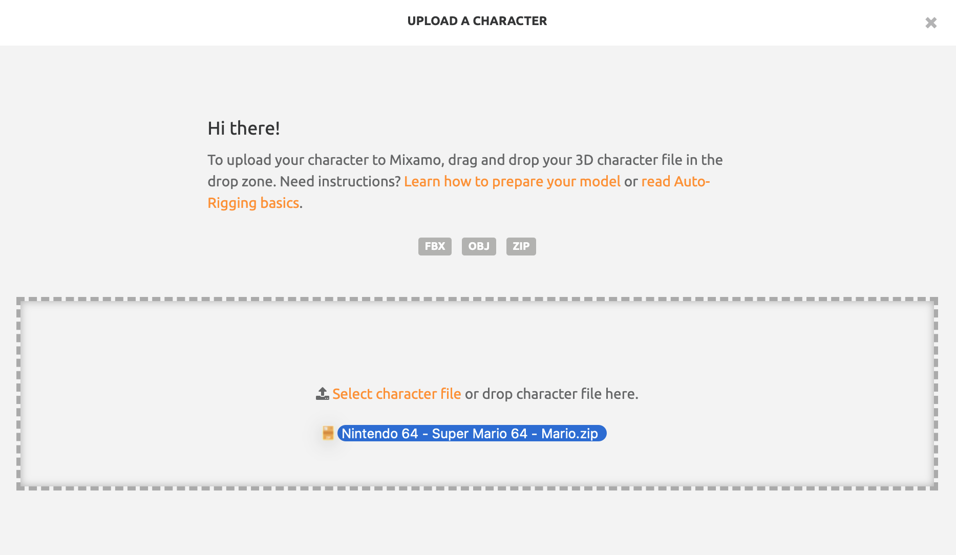 Return to the Mixamo website. Because we are supplying our own character model, click the "Upload Character" button and drag the ENTIRE ZIP file (not the extracted files) for Mario that you downloaded in the prior step. We have to supply the entire ZIP file because the model depends on several files within the archive to render properly and not just the OBJ.