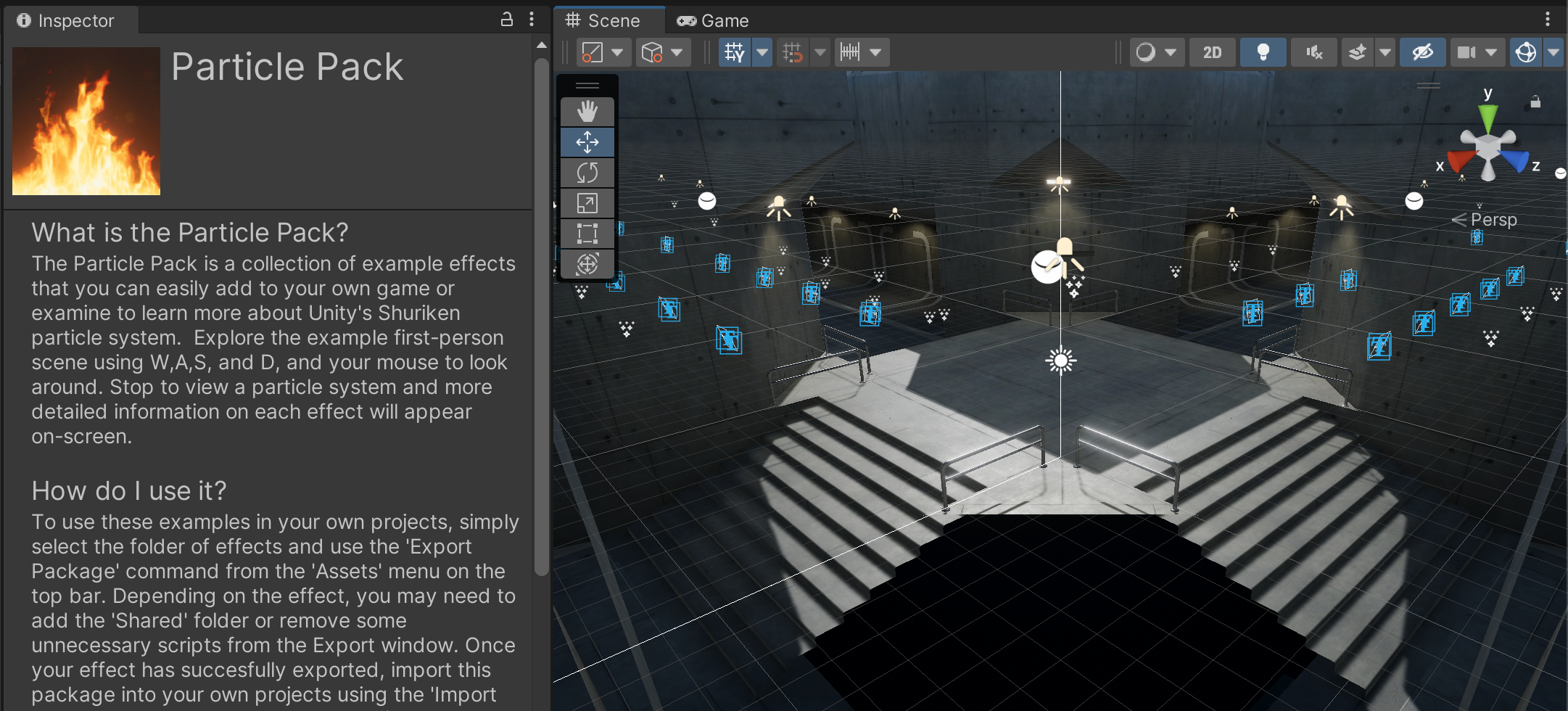 Unity has created a particles showcase as part of the Unity Particle Pack at https://assetstore.unity.com/packages/essentials/tutorial-projects/unity-particle-pack-127325. This sample project takes the form of an exhibit hall showcasing various particle effects. In class, we will examine and dissect various effects from this collection.