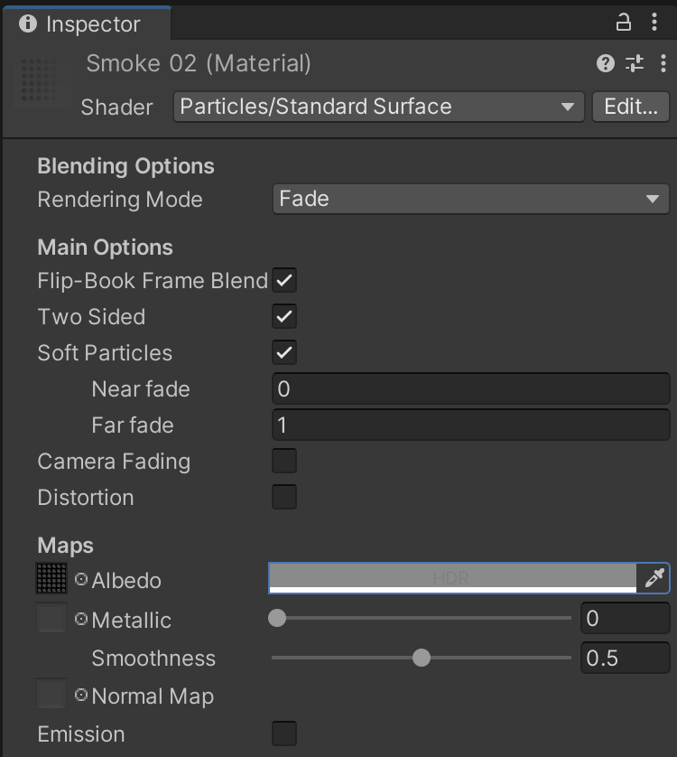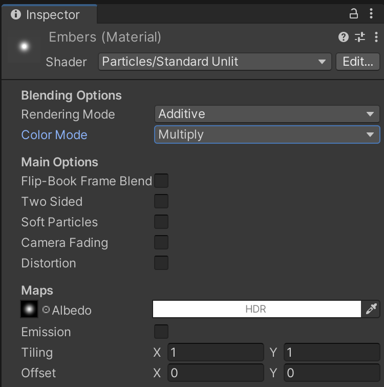 Finally, the Embers material uses an albedo texture that may appear difficult to find at first. You can locate the "Default-Particle" texture used in the Embers material by clicking the small selection circle next to the "Albedo" label.