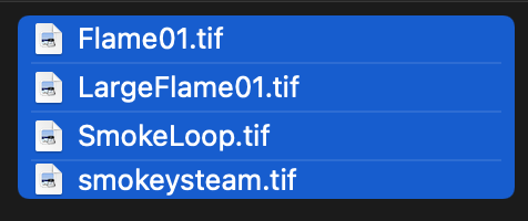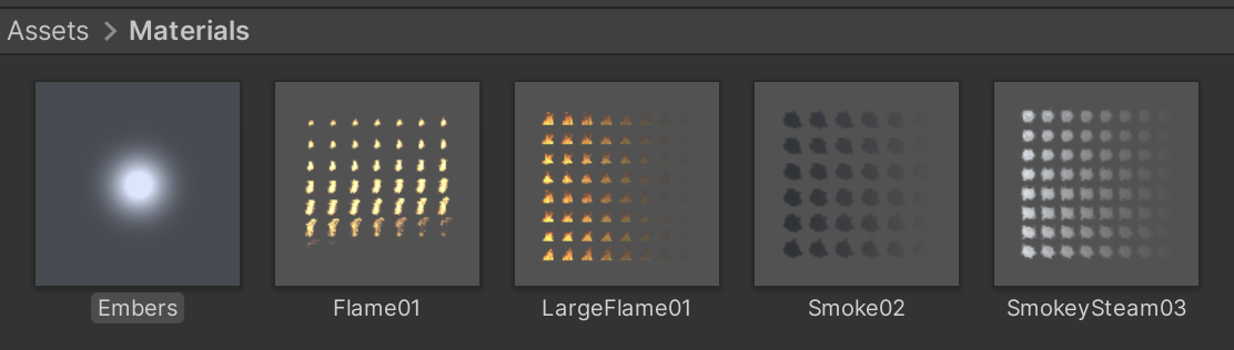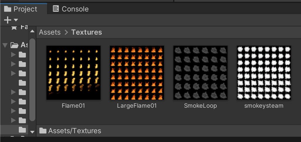 Four image files have been supplied in the class files for this assignment. Locate Flame01.tif, LargeFlame01.tif, SmokeLoop.tif, and smokeysteam.tif and drag these into your /Assets/Textures/ project folder.