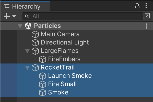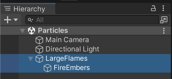 Frequently, an entire particle effect is actually a combination of particle systems working together. To manage the effect as a group, it is common to nest children particle systems in a parent object. Create this game object structure: