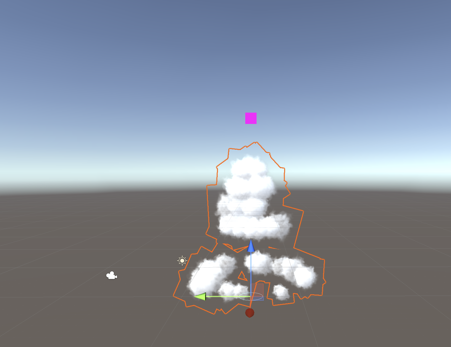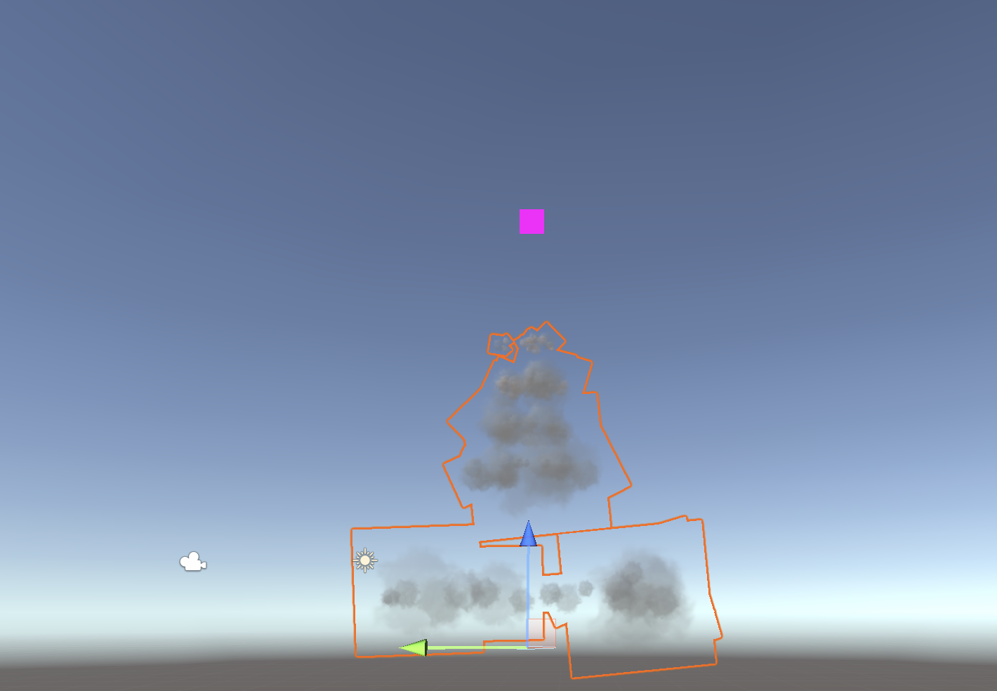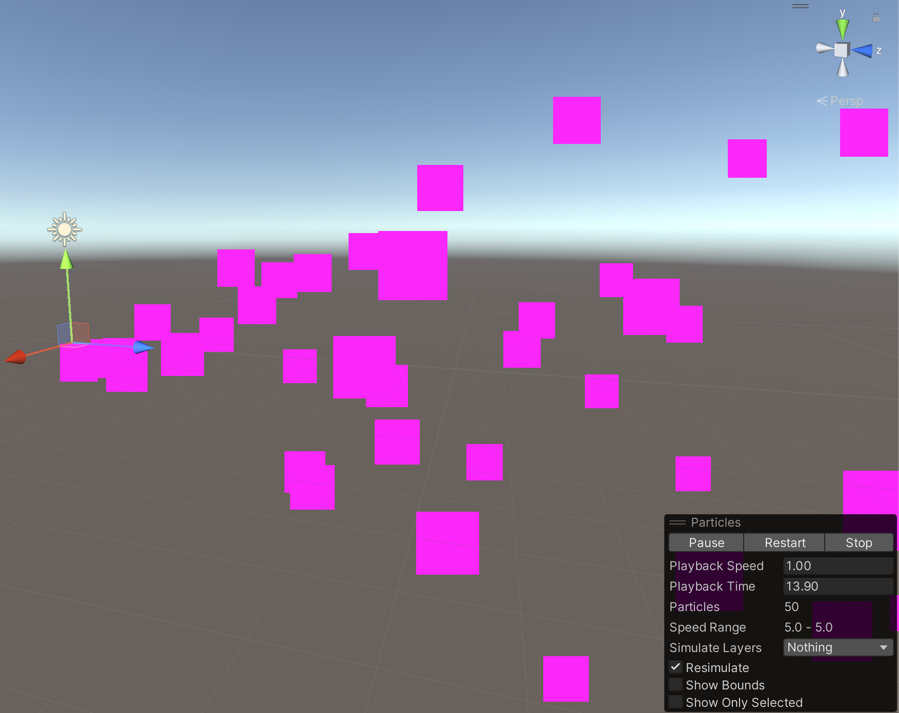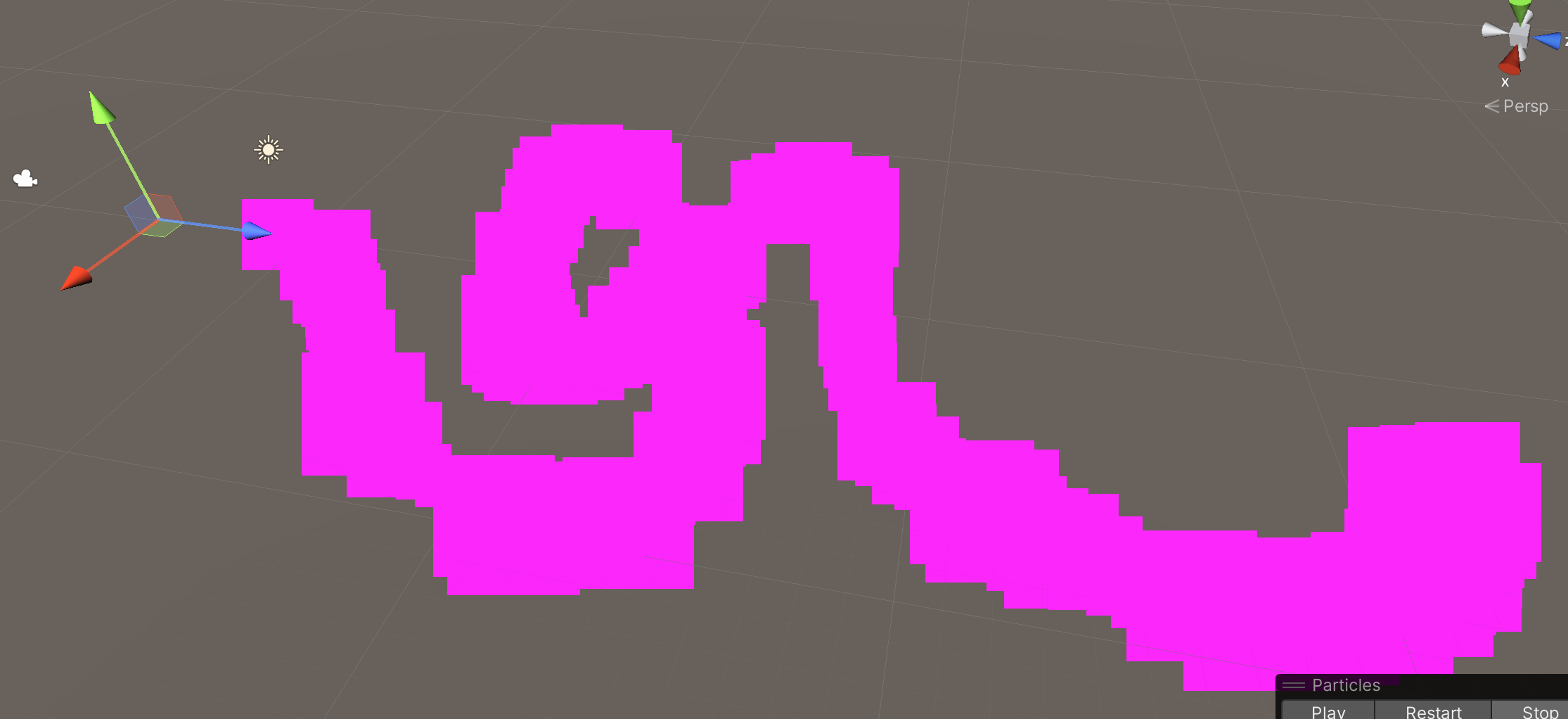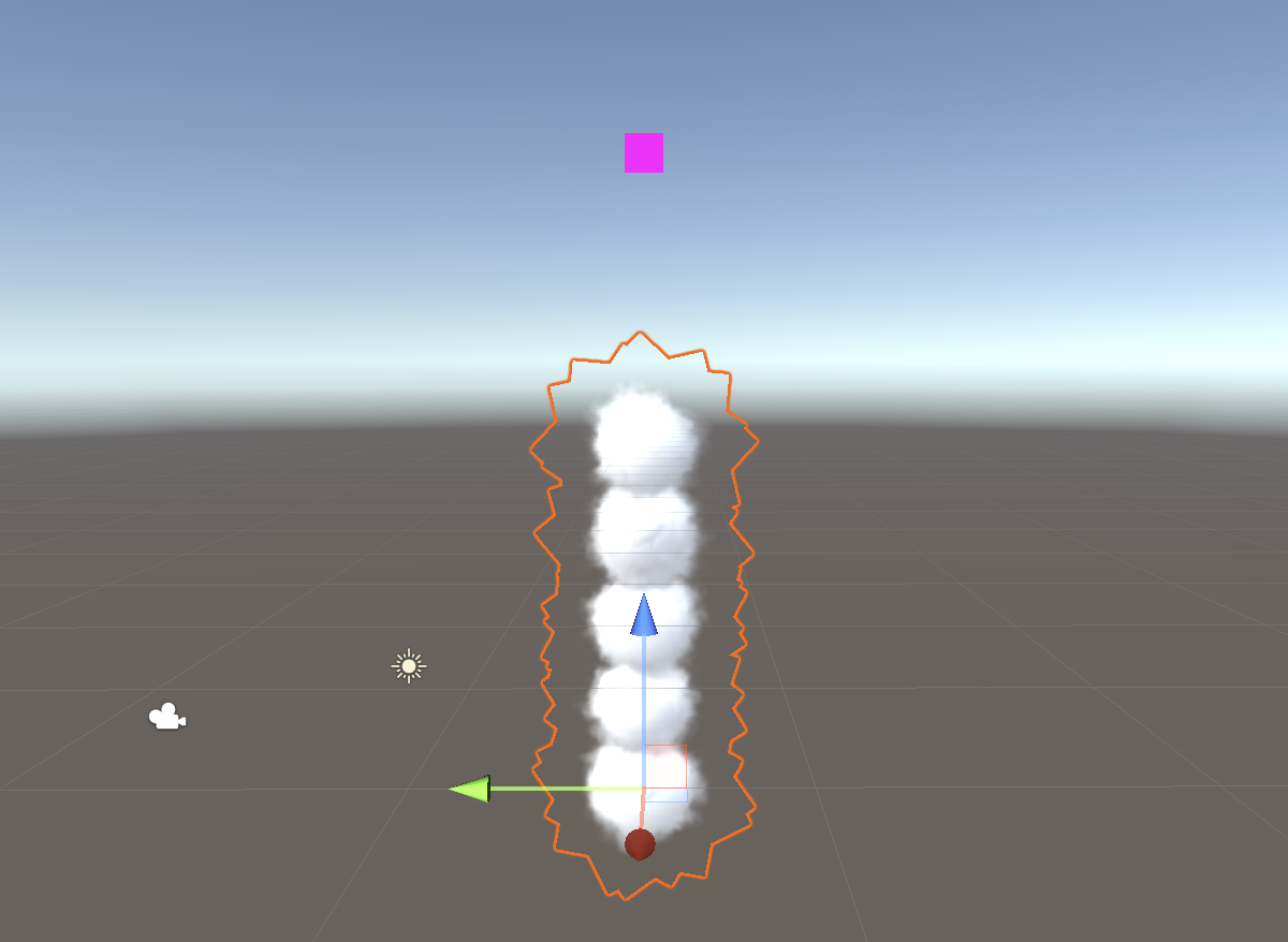 You should see a pink square intermittently shoot into the sky. This represents our rocket flying through the air. The RocketTrail particle effect is interesting because the parent particle system will be invisible. (We will turn off this pink square in a future step.) As this particle travels through the air, it will generate other particle systems which will be visible instead.