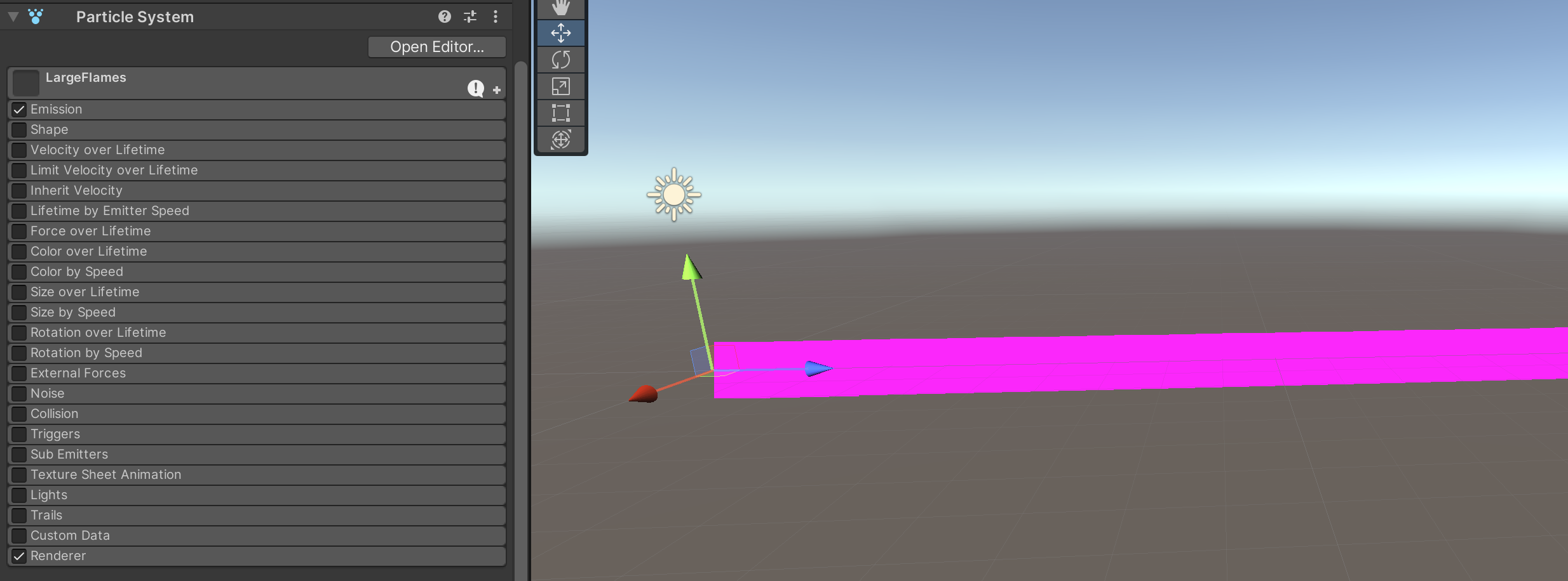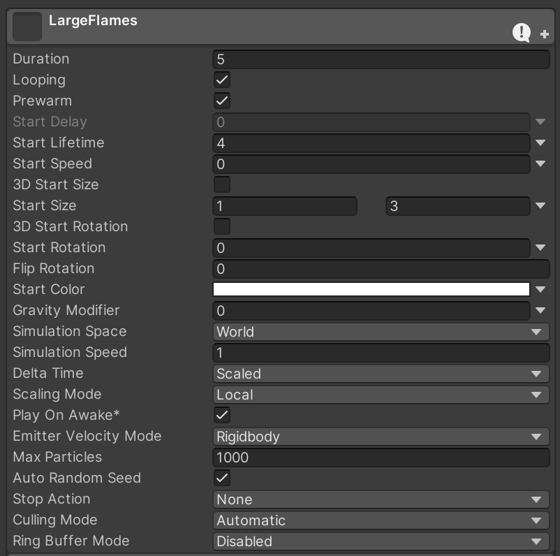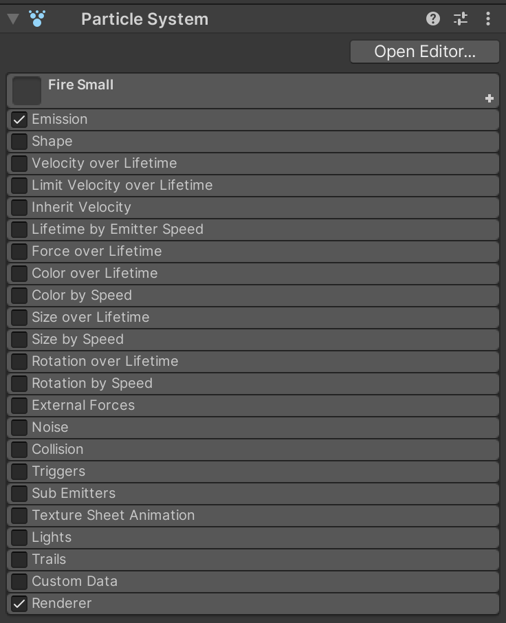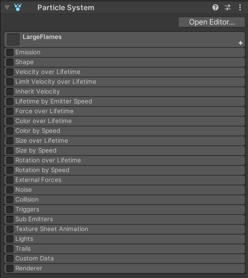 By inspecting the Particle System component on LargeFlames, you'll notice that it's divided in many configuration categories. It's really important that if a category is not mentioned in these instructions, it must be TURNED OFF. For example, not all particle systems in this assignment use the renderer. To help avoid confusion what should be on and off, we'll simply turn everything off to start until we configure the categories we need.