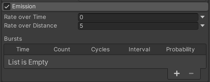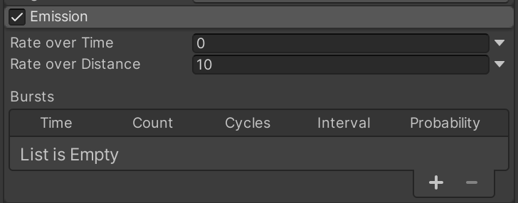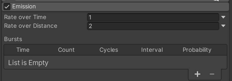Expand the Emission category. Note that the current "Rate over Time" of 10 means the particle system is spawning 10 pink squares per second. Update the settings so that the system spawns 1 particle per second, and 2 particles for every unit of distance moved. (Move the particle system around to see this effect.)