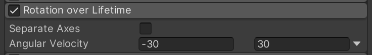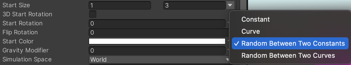 Enable and open "Size over Lifetime." The default setting of using a curve lets you change the size of the particle as time progresses. Instead, we want a constant size, but in a random range. Use the drop-down menu to match this configuration and notice how the pink squares now spawn with random sizes.