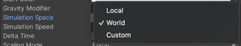 Changing the simulation space of a system from local to world means the particle moves in the global coordinate system and no longer follows the source game object that spawned it. Try moving the particle system around the scene and notice how the particles still move independently.
