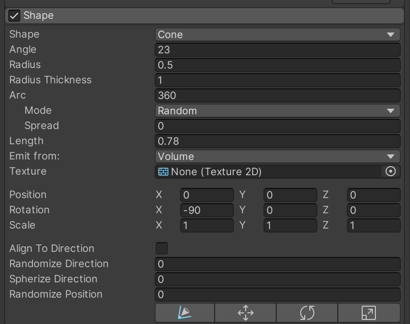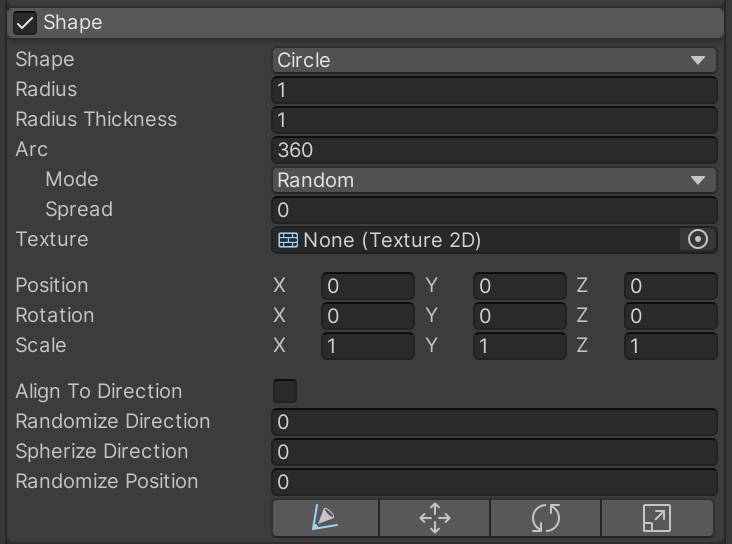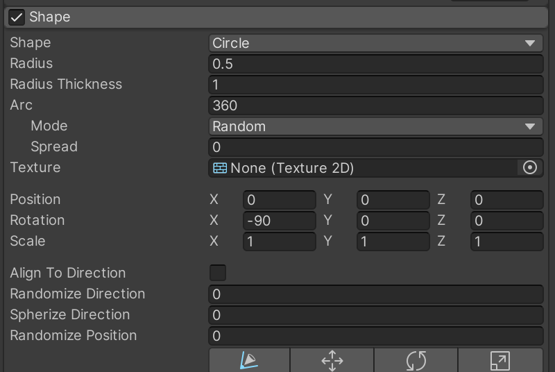 Enable and open the Shape category. Particles can be emitted in a variety of shapes. We want our flames to emit from a circle as if it were contained in a fire pit. It's especially important to rotate on the X axis, so the circle is flat with the rest of the game world.