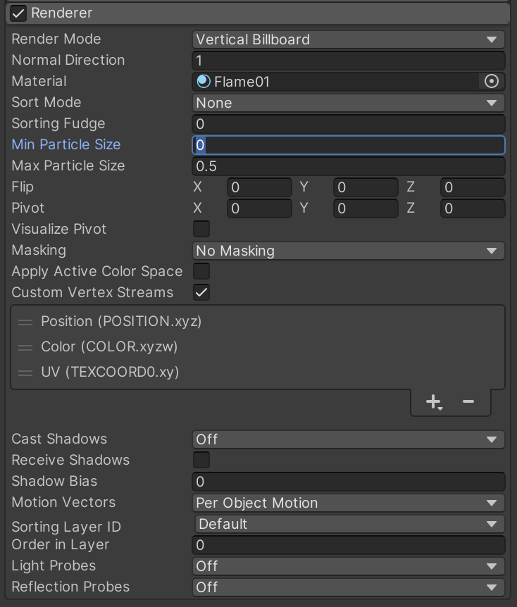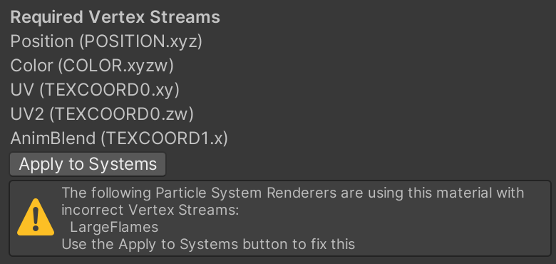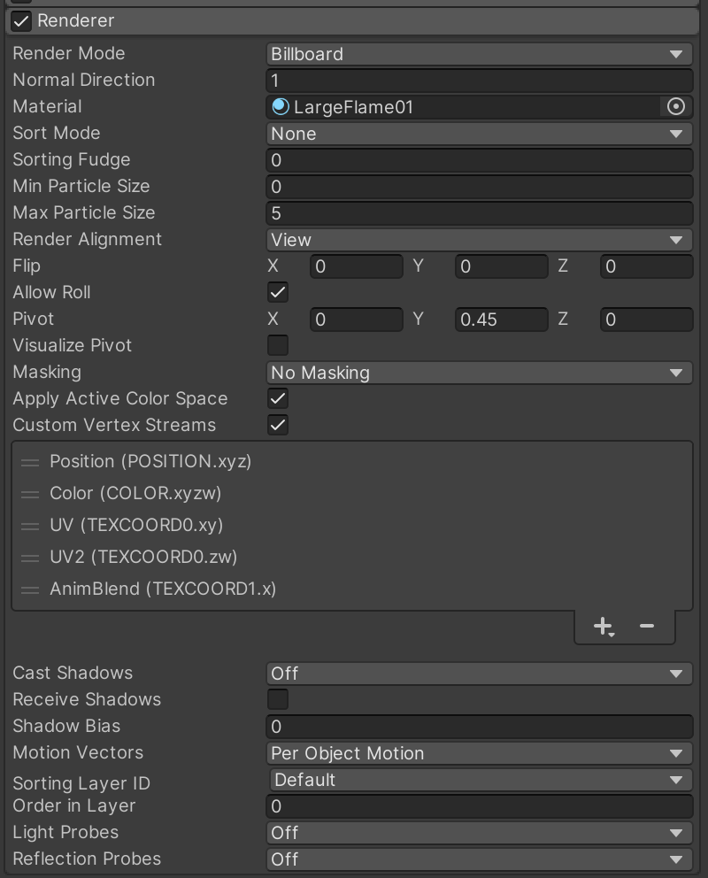 Open the Renderer category (which you enabled previously). This is the configuration that will replace the pink squares with the flame graphics (although with some visual bugs for now). Notice in the second picture below that there is a shortcut for applying the correct "Custom Vertex Streams" by inspecting the LargeFlames01 material and clicking "Apply to Systems."
