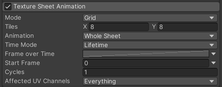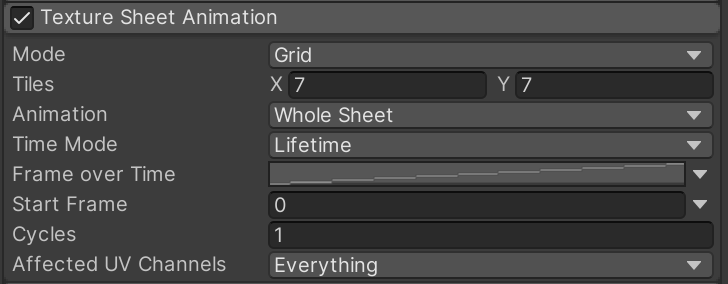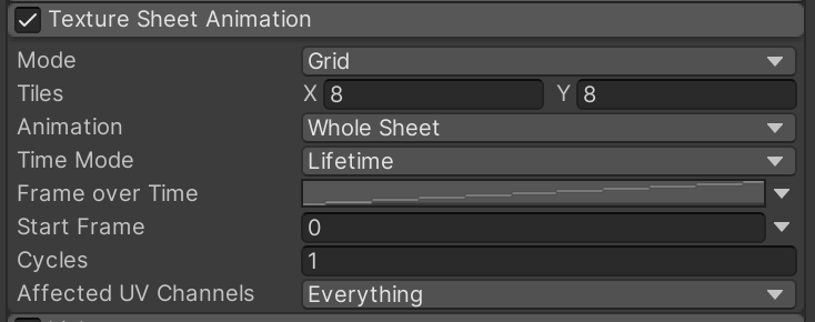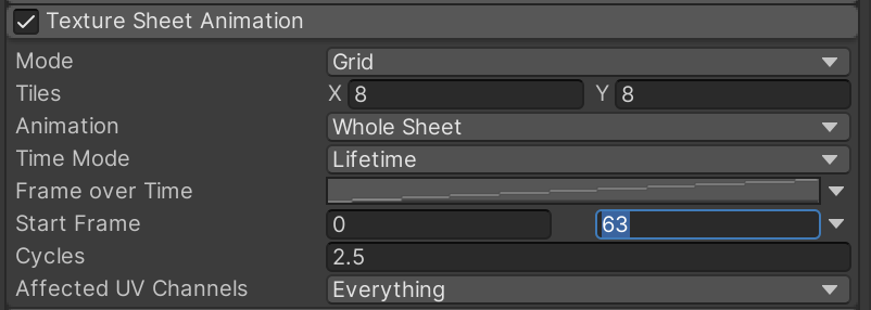 Enable and open "Texture Sheet Animation" and implement these settings to tell the particle system how to convert that grid of flames to an animation. To provide some variety in the flames, we also specify a random start point within the animation loop.