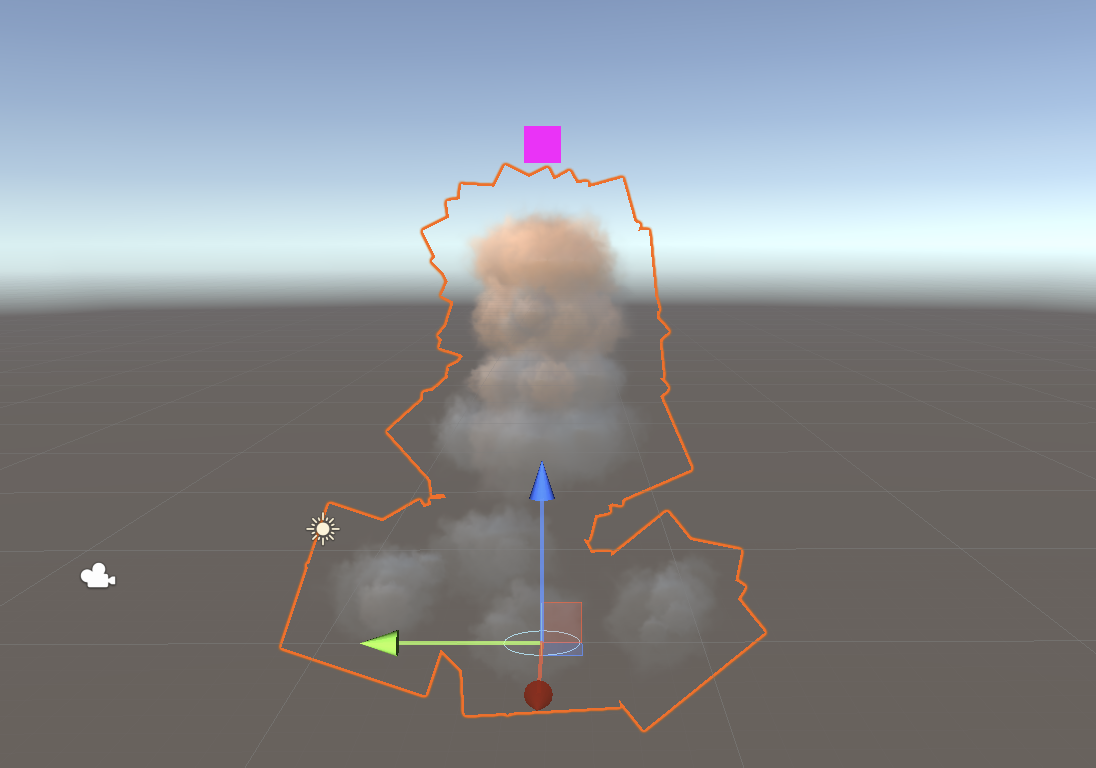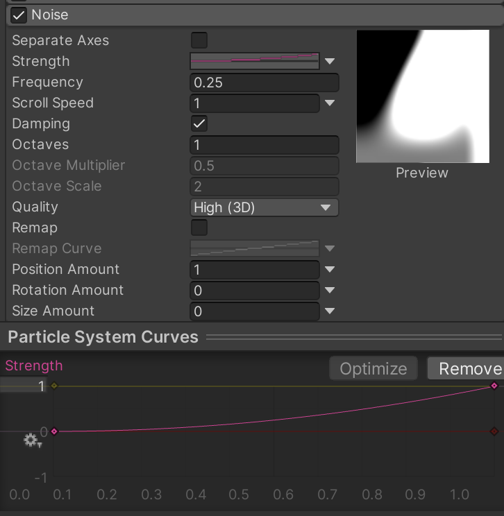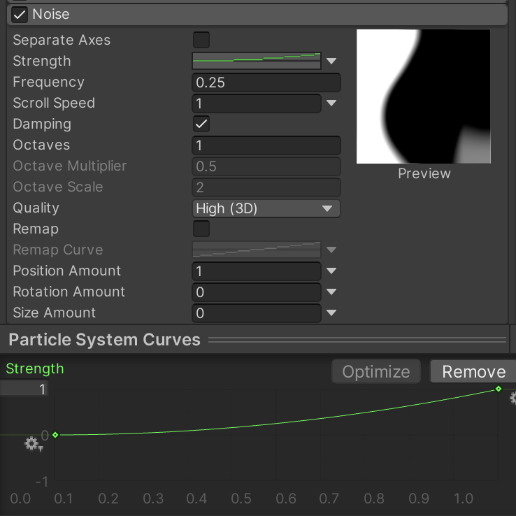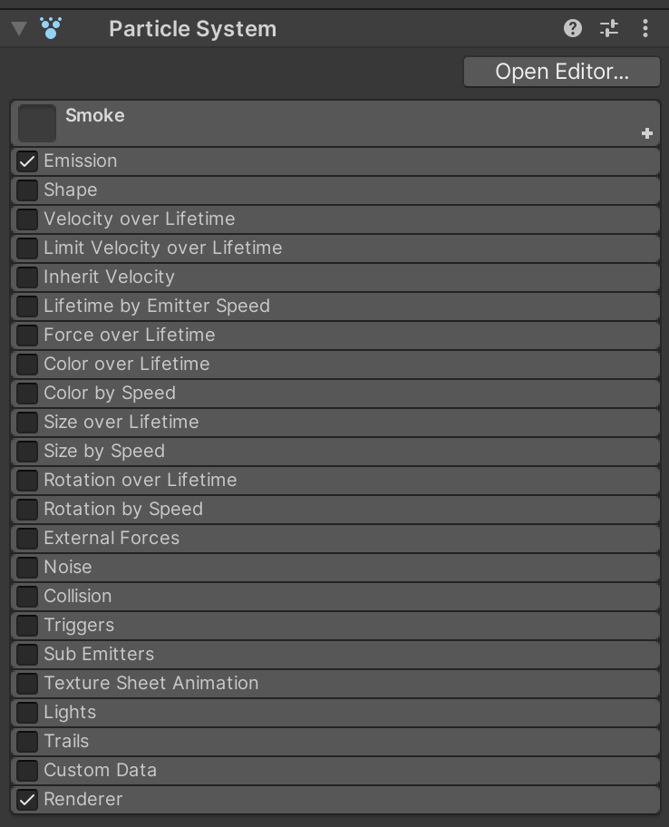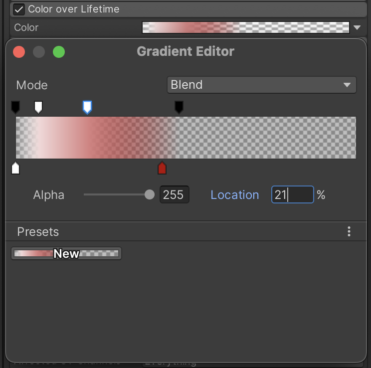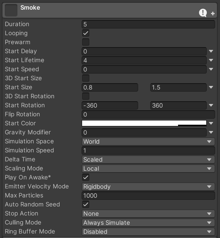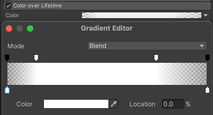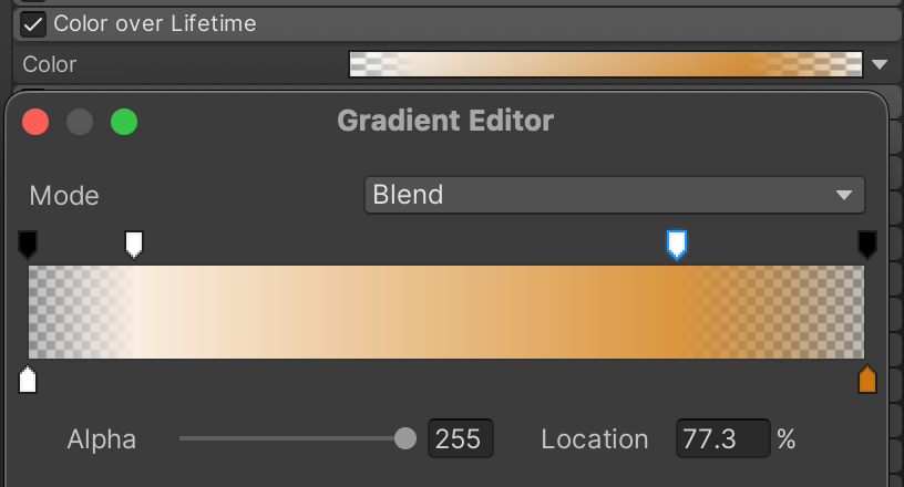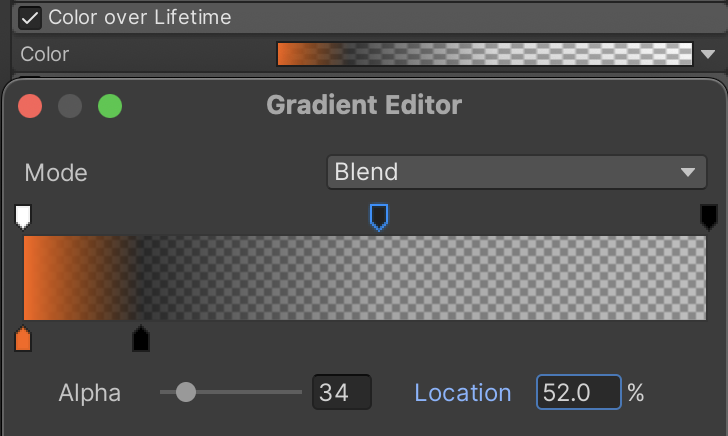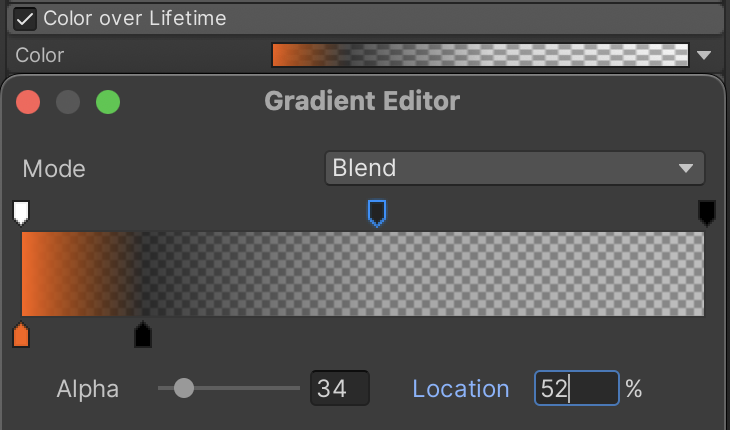 This Color over Lifetime gradient causes the smoke to briefly flash a burnt orange before burning out to black and fading out. Notice how one of the markers is explicitly defined in the screenshot, since it is harder to guess these settings at a glance.