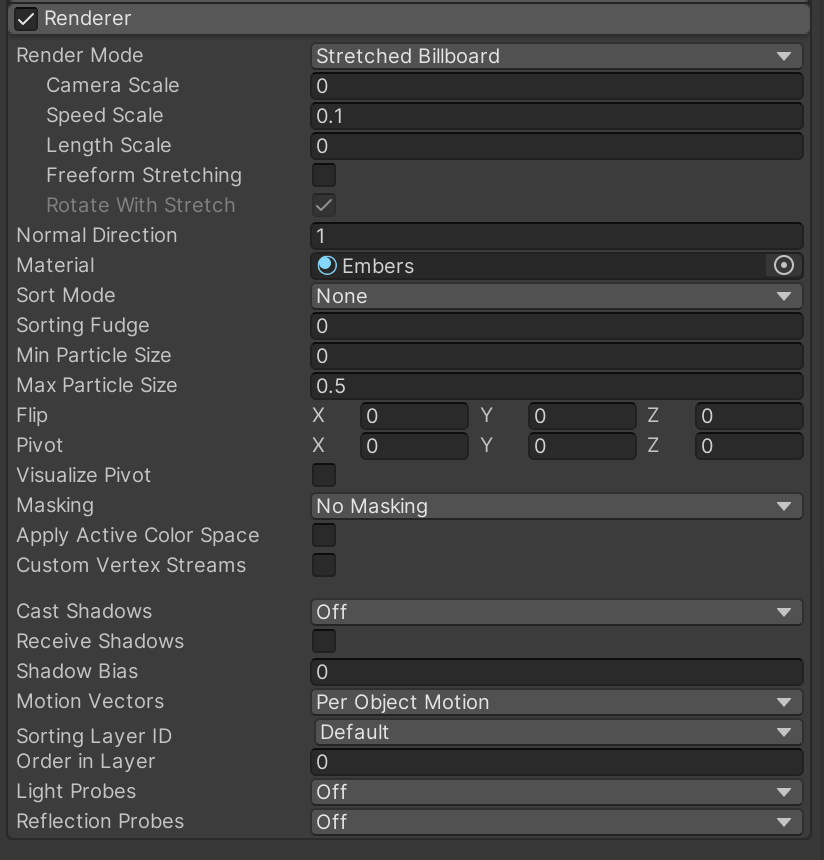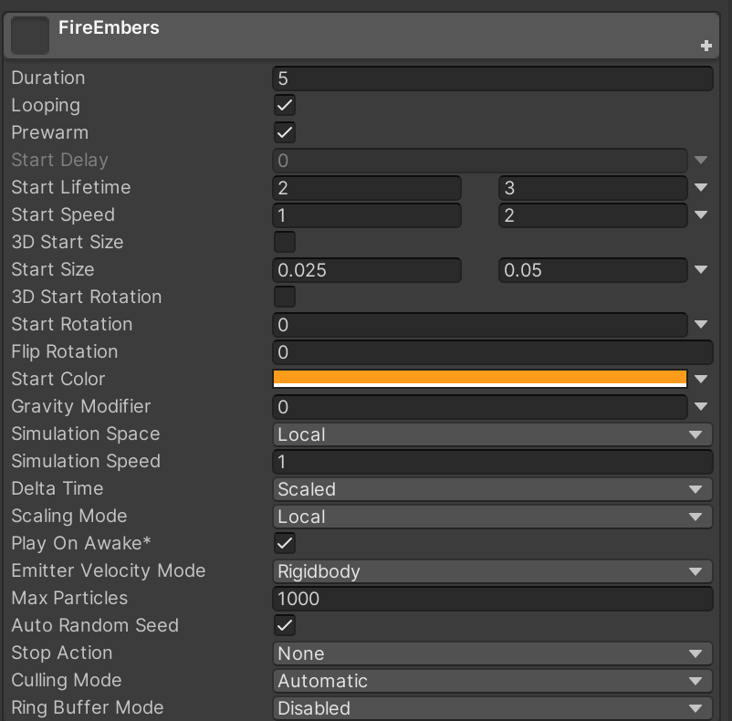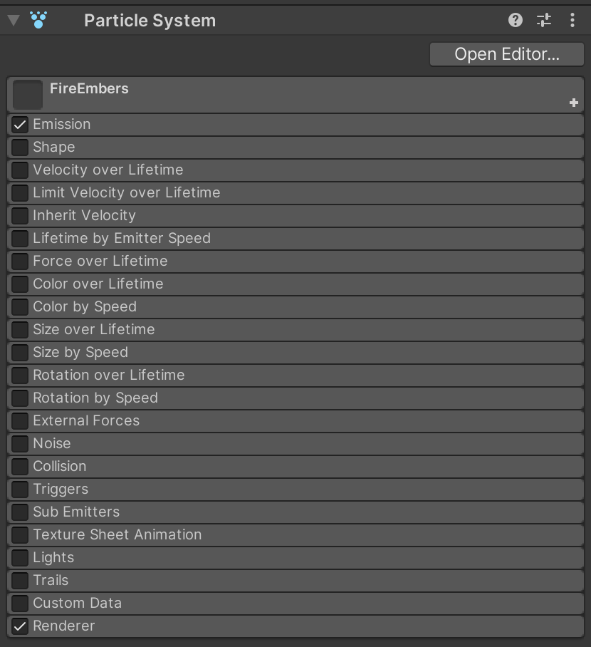 At this point, the LargeFlames system is complete and it is time to configure the child FireEmbers system. Just like before, turn off all of the categories until you actually need to configure them. We will start with the Emission and Renderer categories enabled.